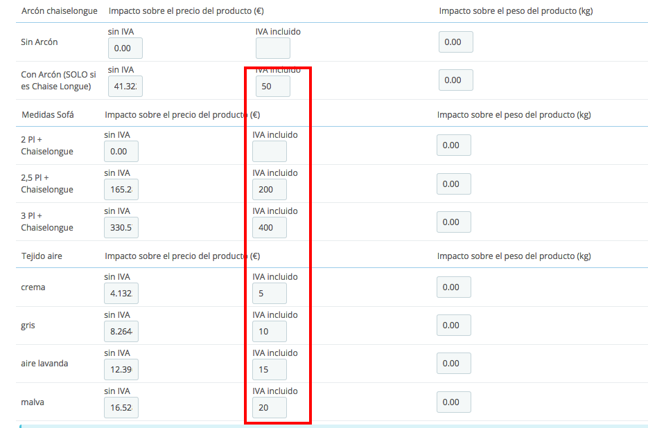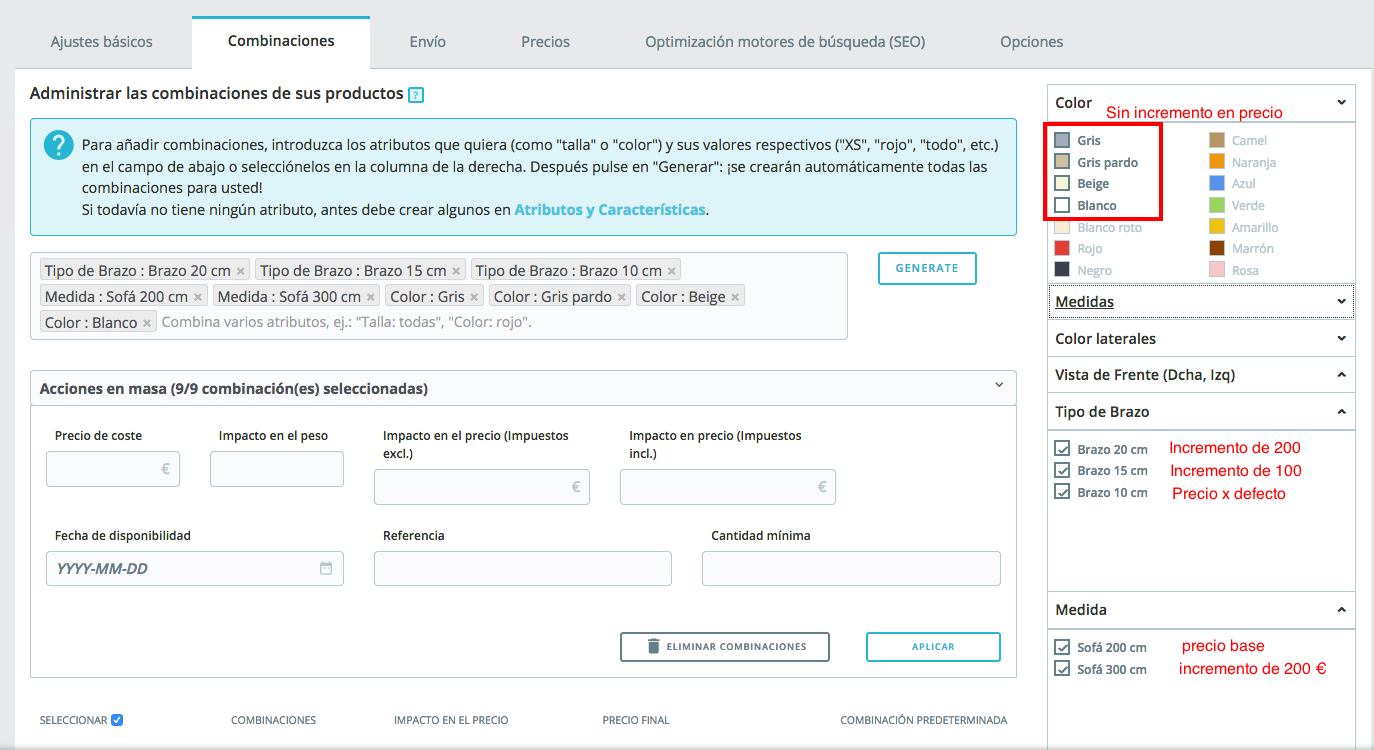 master05 Posted March 20, 2017 Share Posted March 20, 2017 Buenos días. Estoy creando una nueva tienda en Prestashop 1.7 y no veo o no se como utilizar la funcionalidad de generar combinaciones en PS1.7 como se hacía en PS1.6 para introducir incrementos de precios por los diferentes atributos. Me explico: Un producto que puede ser un sofá, con tres medidas de anchura, dos medidas de brazo de sofá, y sus texturas, no veo como generar automáticamente el incremento correspondiente para cada una de estas medidas. en 1.6 yo incrementaba en el generador de combinaciones 50 € para la medida 1, 100€ para la medida 2, 20 € para la primera medida de brazo y 50 € para la segunda medida de brazo por ejemplo. Pues bien, PS1.6 se encargaba el solo que crear todas las posibilidades (combinaciones posibles). En PS1.7 no encuentro está opción. Parece que una vez que has generado todas las combinaciones, después tienes que entrar una a una o marcando las que compartan precio y realizarle el incremento. Espero que esto se pueda solucionar de alguna manera, porqué sino, es un gran paso atrás. adjunto imágenes de ejemplo. Por favor, ayuda con este tema. Link to comment Share on other sites More sharing options...
