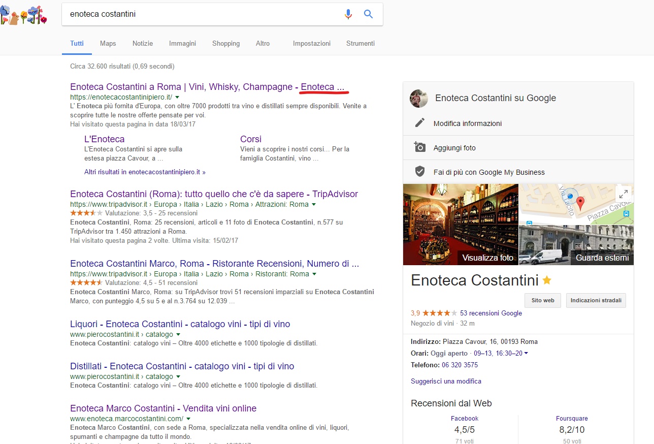 Abbiamo un problema che si presenta nei risultati di ricerca, come potete vedere nell'immagine allegata dopo la frase settata nell' URl e Seo 'Enoteca Costantini a Roma | Vini, Whisky, Champagne' segue un' altro 'Enoteca Costantini' che risulta castrato essendo troppo lungo. Come posso eliminare l'ultimo 'enoteca Costantini'?