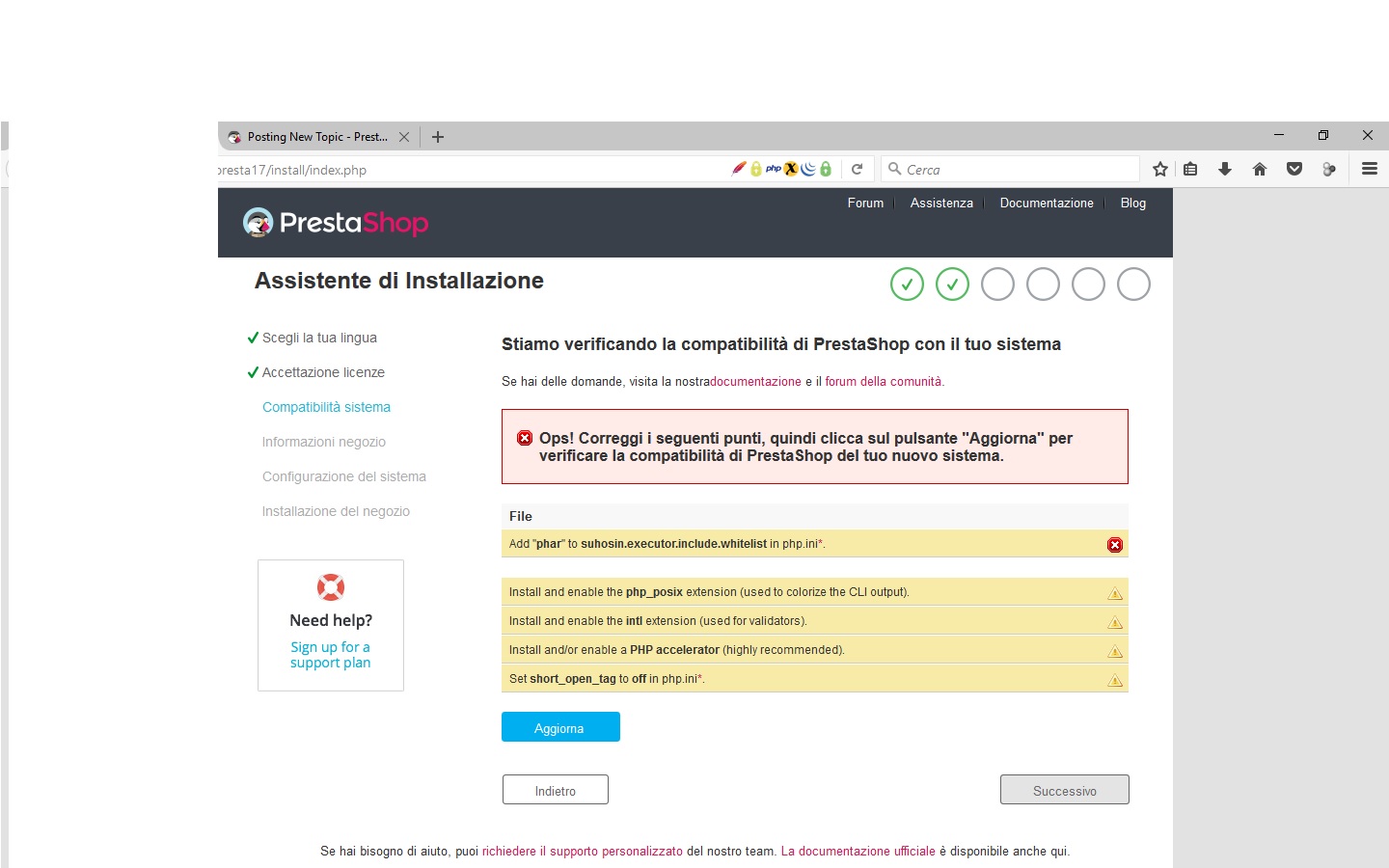 shumy300 Posted March 20, 2017 Share Posted March 20, 2017 Ciao, durante l'installazione della versione 1.7 compare questo messaggio: Add "phar" to suhosin.executor.include.whitelist in php.ini ed altri errorini che allego. Aiuti? Grazie. Link to comment Share on other sites More sharing options...