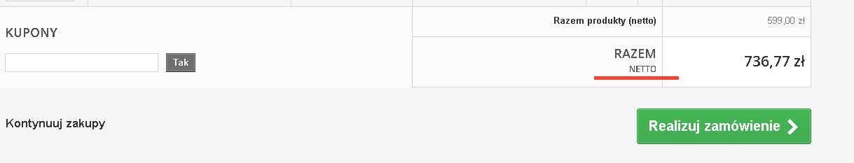 Ktosinka Posted March 22, 2017 Share Posted March 22, 2017 Dzień dobry, Niedawno zmieniłam w sklepie wyświetlanie cen z brutto na netto i zauważyłam, że po tej zmianie w koszyku jest błąd w podsumowaniu całej wartości koszyka. Razem produkty (netto) tutasj suma się zgadza, ale już poniżej Razem Netto nie zgadza się opis bo powinno być BRUTTO Próbowałam szukać błędu w tłumaczeniach ale nie udało mi się tego znaleźć. Macie pomysł gdzie grzebać, żeby to zmienić? PS: w mailu z podsumoaniem jest wszystko OK, tylko wyświetlana informacje RAZEM NETTO w samym koszyku jest błędna. Wartości się zgadzają. Link to comment Share on other sites More sharing options...