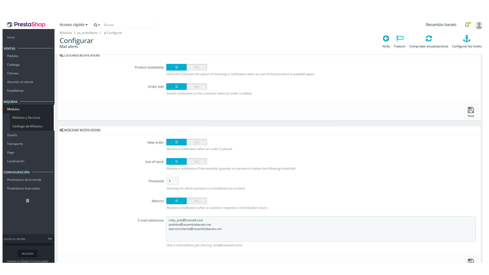 aprendiendopresta Posted April 10, 2017 Share Posted April 10, 2017 Hola Buenas tardes.. Tengo instalada una tienda en prestashop 1.7. He instalado el módulo gratuito mail alerts para que pueda recibir correos de pedidos de los clientes... He hecho varias pruebas y como cliente recibo bien el correo del pedido realizado pero como empresa no recibo ningún correo de notificación. He mirado en spam y tampoco sale, he puesto varios correos pero tampoco recibo nada. A alguien le ha pasado algo igual que a mi, me podíais decir donde podría mirar o como solucionar este problema. Gracias de antemano adjunto la configuración modulo-alerta.jpg Por la pinta es un problema de como esta configurado la cuenta de correo. Vete desde el BAckoffice a Parametros Avanzados y después a Correo Electrónico. Acto seguido configura la zona de Email y ya deberia estar. Link to comment Share on other sites More sharing options...