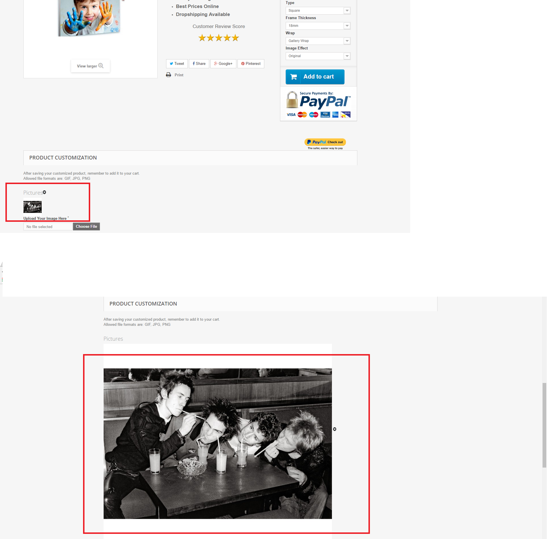 geekyprint Posted March 23, 2017 Share Posted March 23, 2017 (edited) Hi there i have added an upload section to my prestashop, once I upload an image it becomes really small the thumbnail Is there anyway i can make this bigger so the customer can see the image they have uploaded happy to tip you if you can help me on this, please see the attached images. The 1st image is my website, as you can see the uploaded image is really small, the 2nd image is another website with the upload feature, here you can see a large image preview. Can you let me know how to change the size of this? Edited March 23, 2017 by razaro (see edit history) Link to comment Share on other sites More sharing options...