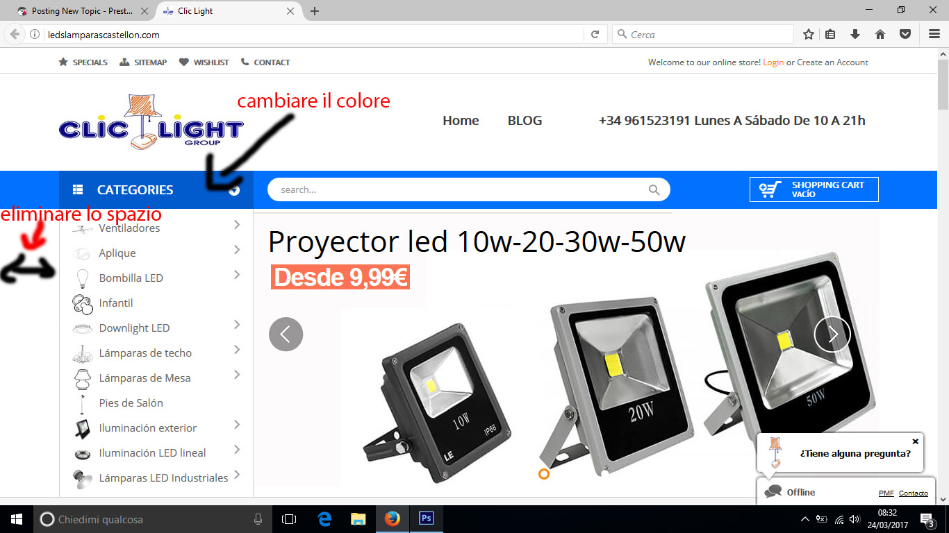 lordvolto Posted March 24, 2017 Share Posted March 24, 2017 Ciao sono nuovo e alle prime armi con prestashop. Vorrei modificare la templata del mio sito: come potete vedere dalla foto mi piacerebbe cambiare il color della riga in un azzurrino + chiaro e eliminre lo spazio laterale che si crea nella pagina. è possibile? vi ringrazio e spero che abbia inserito questa discussione nella sezione giusta. ciao Link to comment Share on other sites More sharing options...