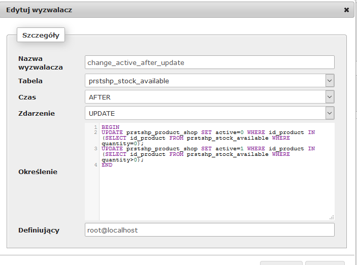 Witam próbuje dodać wyzwalacz w phpmyadmin tak jak w załączniku: jednak wyzwalacz się nie uruchamia.