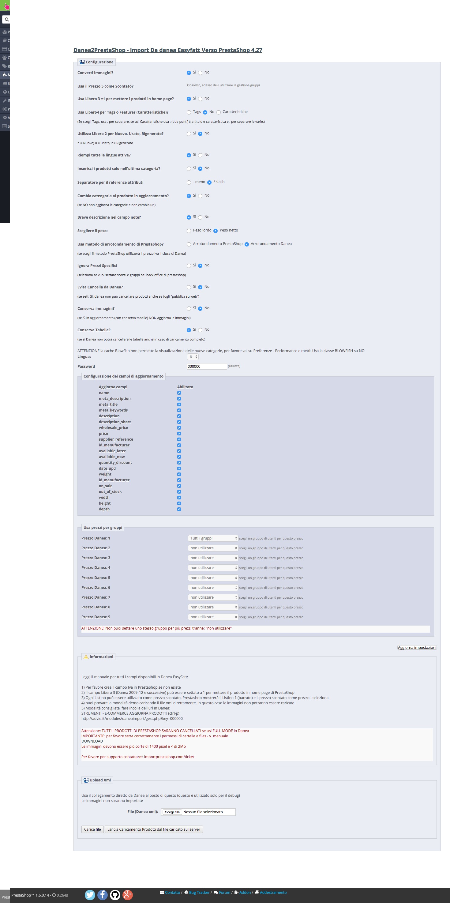 Andrea_Firenze Posted March 25, 2017 Share Posted March 25, 2017 Ciao a tutti, Ho un problema con l'importazione dei prodotti da Danea attraverso il modulo Danea2Prestashop (ver. 4.27), al mio prestahop (1.6.0.14). Inizialmente provando a fare il caricamento completo mi dava sempre errore 500 o timeout dal server, scoperto poi tramite host che la dimensione del pacchetto inviata è troppo grande e quindi il server non l'accetta entrando in timeout. Quindi effettuo il caricamento solo degli oggetti modificati, e qui mi tocca segmentare i prodotti in piccoli gruppi a cui fare modifiche e poi caricarli. ma il problema è qui: - Le categorie, costruite in Prestashop con lo stesso criterio di quelle costruite in Danea, da essere visibili prima del caricamento vanno in errore 404, e vedo solo i prodotti in Home page. - I prezzi, nonostante siano state levate le regole tasse da Prestashop per lasciare la gestione del prezzo iva inclusa totalmente a Danea, a spesso non sono uguali a quelli caricati in Danea. Per esempio se un prodotto con tasse incluse in Danea costa 4,60, in prestahop lo trovo a 3,81 In allegato invio lo Screen di come è impostato il Modulo, se qualcuno avesse il modulo e riesce a caricare perfettamente, mi può dire se è impostato correttamente? Ci sono impostazioni di importazione da cambiare nel programma di Danea? Se provassi a cancellare ogni cosa dal sito, tipo categorie e prodotti, e provassi a ritirare su da Danea attraverso il modulo, i gruppi di prodotti in modo da non mandare il caricamento in timeout, prestashop si ricarichè in maniera corretta facendomi vedere le categorie e i prodotti all'interno di esse? Sto sbattendo la testa su questo da qualche tempo, e non ho idea da che parte rifarmi. Grazie per l'attenzione, e per l'aiuto a chi me lo potrà dare. Link to comment Share on other sites More sharing options...