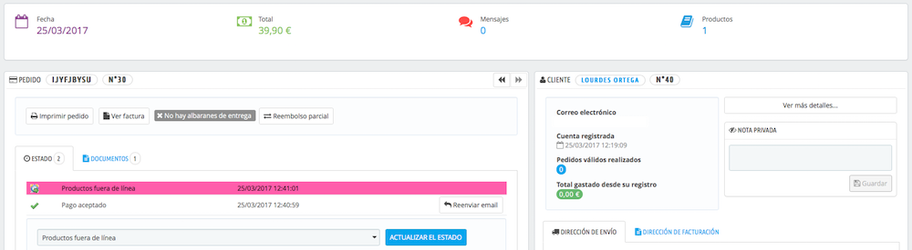 Itsenjoyable Posted March 25, 2017 Share Posted March 25, 2017 Buenas tardes Esta mañana han hecho un pedido en la tienda online que administro y resulta que el producto que el cliente ha adquirido estaba fuera de stock. De modo que después de haber hecho el pago éste ha recibido un mail automático avisando de que no había stock del producto. Lo que no acabo de entender es que en la lista de pedidos del backoffice se indica que el pago se ha realizado (Redsys) pero en el detalle en concreto del pedido, en la ficha del cliente, consta que sus pedidos realizados son 0 y el total gastado 0,00€. Mi pregunta es: ¿Se ha realizado el pago? ¿O el cliente tiene que realizar de nuevo el pedido? Adjunto captura del detalle del pedido. Muchas gracias de antemano. Saludos Link to comment Share on other sites More sharing options...