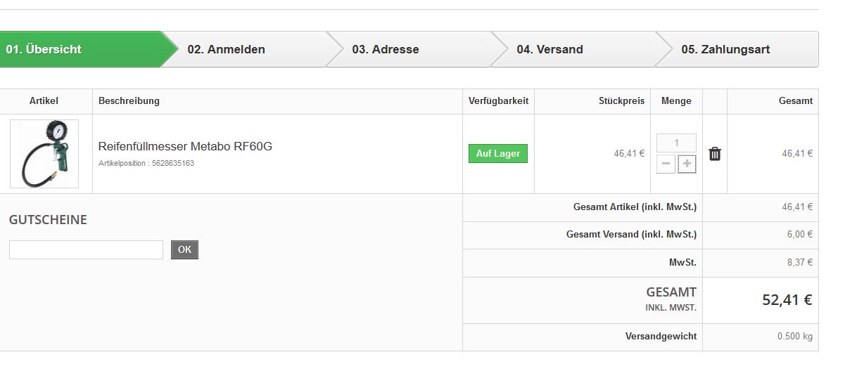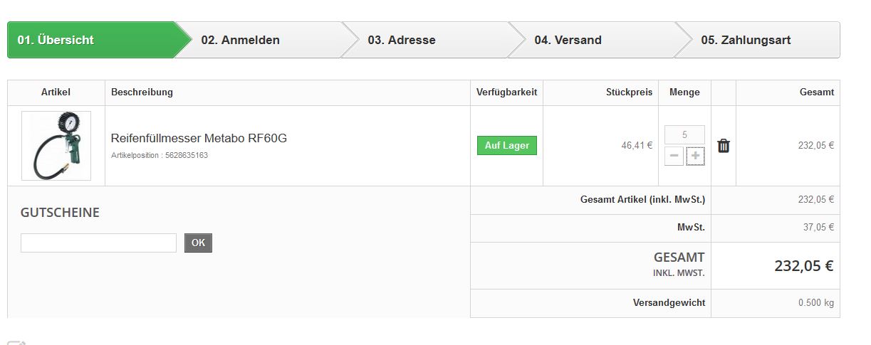 Claudiocool Posted March 26, 2017 Share Posted March 26, 2017 (edited) Hallo zusammen, mir fiel gerade auf, wenn ich im Warenkorb bin und bei einem Artikel die Menge ändere, bleibt das Versandgewicht dasselbe, es aktualisiert sich nicht. Oha, dachte ich, da kann einem dann ein ausländischer Kunde, der ja Versandkosten nach Gewicht bezahlen muss, ein nettes Schnippchen schlagen... Neee, das funktioniert kurioserweise.... So, also zeigt er das neue versandgewicht nur nicht an, gerechnet wird es aber korrekt. Also scheint hier nur die Anzeige nicht zu refreshen. Ist das bei Euch auch so? Ich frage, weil ich ausschließen möchte, dass hier irgendein Modul reinspuckt. Edited July 21, 2017 by Claudiocool (see edit history) Link to comment Share on other sites More sharing options...