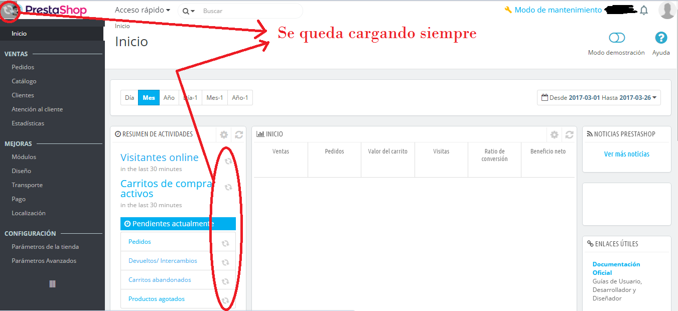 javisilencio Posted March 26, 2017 Share Posted March 26, 2017 Necesito ayuda. Acabo de instalar Prestashop 1.7 y hay un error grave que se muestra desde el primer momento en que completé la instalación. En determinadas secciones del backoffice (inicio, estadísticas, pedidos...) se queda cargando sin parar. Suele aparecer la información, pero el sidebar del menú no me deja acceder a subcategorías. En el apartado inicio directamente no carga ninguna estadística, aparece el icono de las flechas girando todo el tiempo (el icono de que está cargando). En algunas secciones (catálogo, módulos...) sí carga y no se produce este error. Envío una captura de la pantalla de inicio donde aparece todo cargando. ¿Alguna idea de cómo solucionarlo? Link to comment Share on other sites More sharing options...