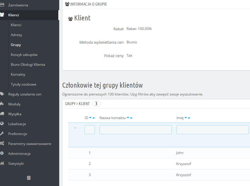 0 krzysiek_web Posted March 29, 2017 Share Posted March 29, 2017 Hmm która wersja presty? Klient jest przypisany do grupy i dla gruby jest zniżka. Po wejściu w edycję grupy masz listę klientów którzy się w niej znajdują u góry pisze że jest także % zniżki? Testowałem to właśnie na wersji starszej 1.6.1.1 i całość działa prawidłowo. Link to comment Share on other sites More sharing options...