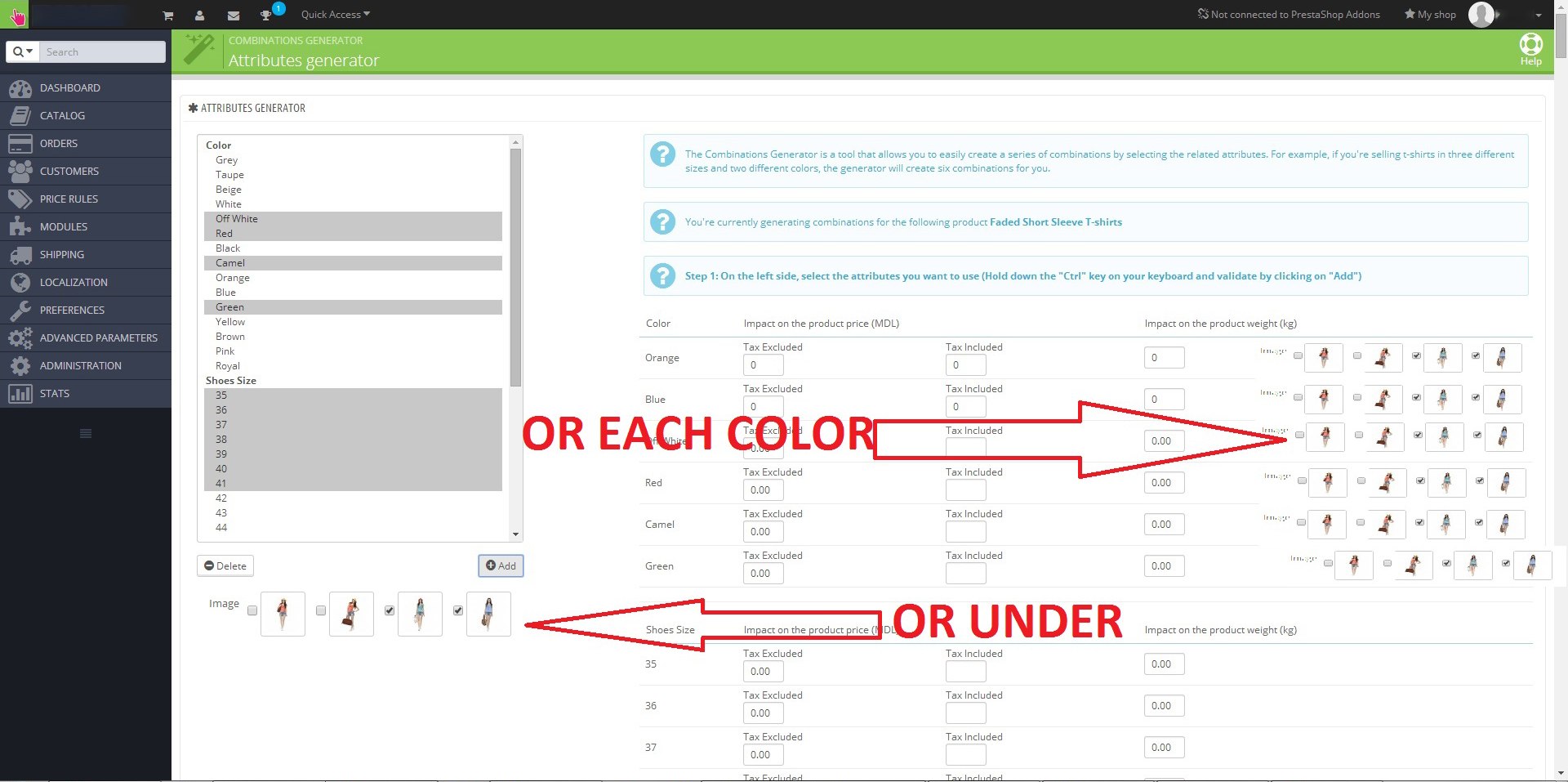 Can someone tell me how I display all the images of a product in the Attributes/Combinations Generator?