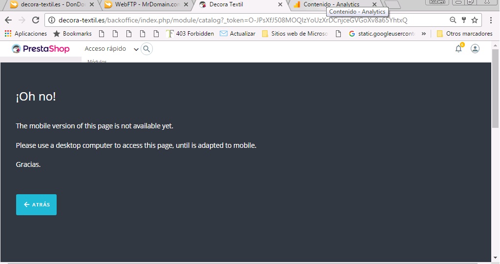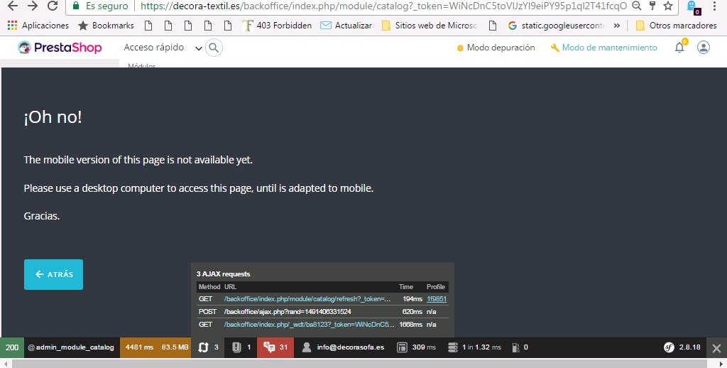 Admin27 Posted April 3, 2017 Share Posted April 3, 2017 (edited) Hola buenas tardes, hoy mismo prestashop a sacado una nueva versión de prestashop de la 1.7.0.6 a la 1.7.1.0, la actualización ha sido un desastre. Me encuentro ahora mismo que los módulos no funcionan y no puedo acceder a ellos, apareciendo en mi backoffice la siguiente pantalla, que he capturado y adjuntado, esto me sucede estando en el pc, no en el mobil. En cada actualización me doy cuenta que prestashop la está fastidiando cada vez más... Si sabe la solución a este problema, le agradecería que lo añadieran. Edited April 5, 2017 by Admin27 (see edit history) Link to comment Share on other sites More sharing options...