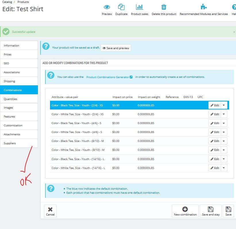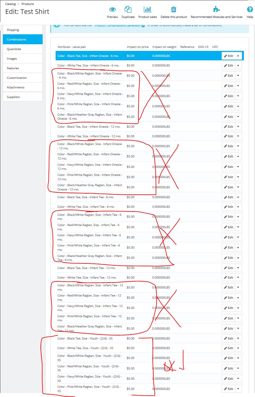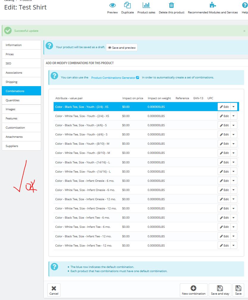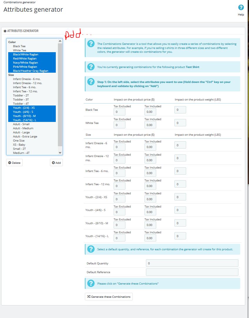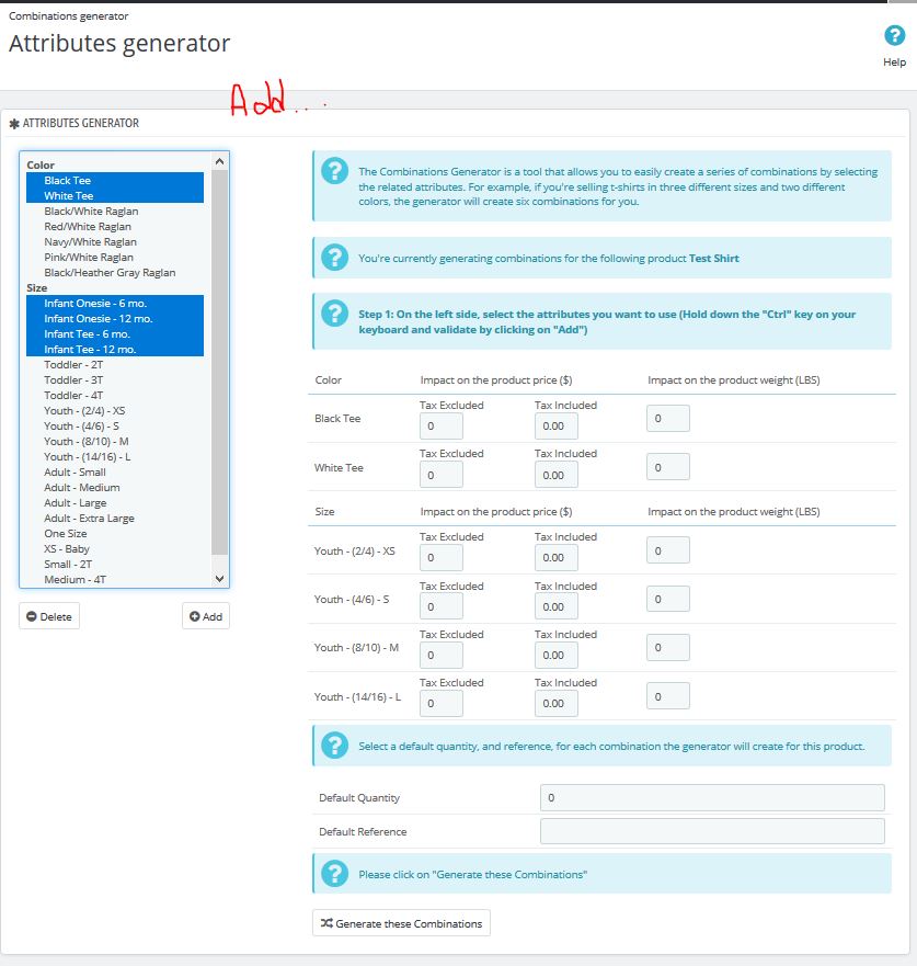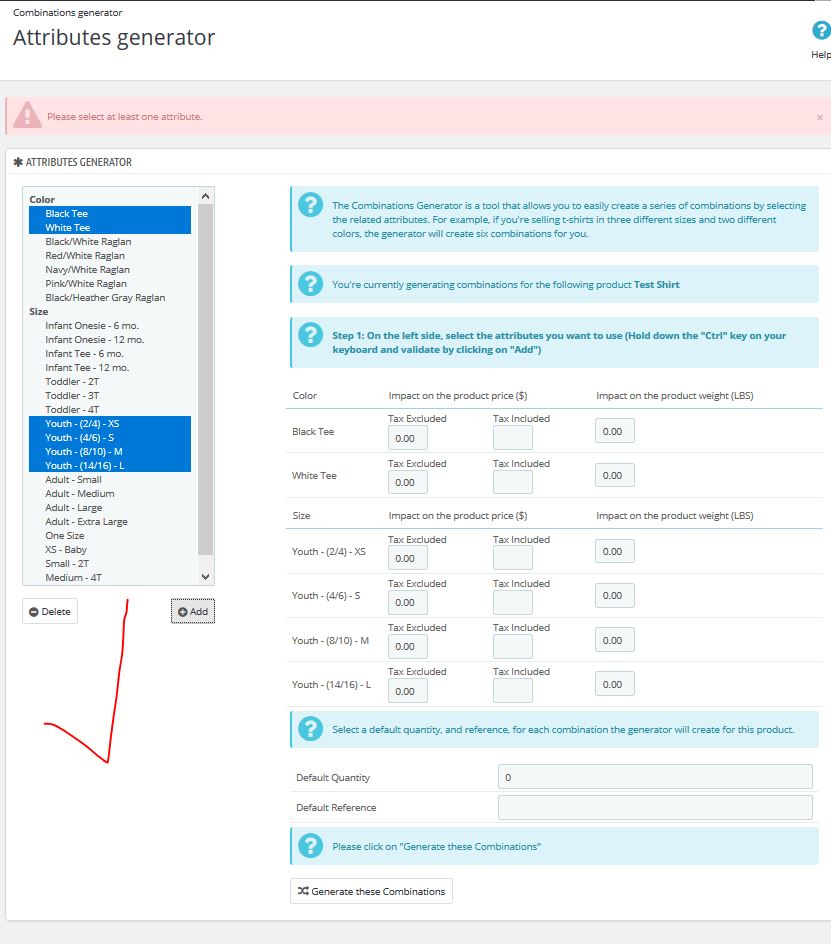 Hi Presta Pros! I hope someone here may have some insight on generating combinations without having to purchase add-on modules. I'm hoping it's something I overlooked. I've scoured the forums and can't find my specific problem. I thought I would ask here first.