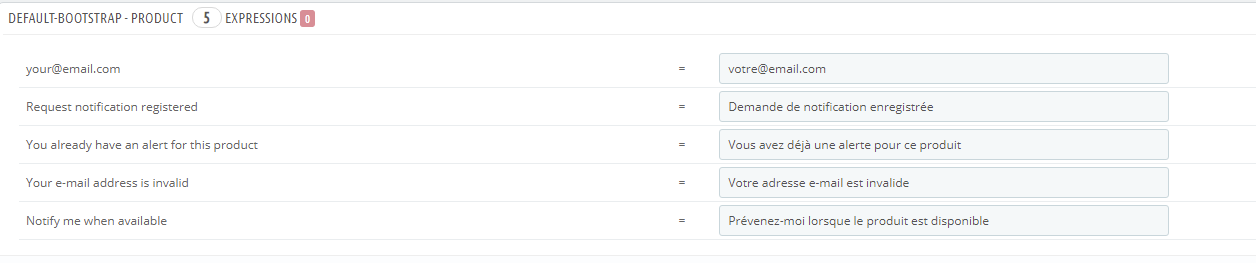 Shonen Posted June 24, 2021 Share Posted June 24, 2021 Parce que vous êtes sur Prestashop 1.6 et que vous n'avez pas prévenu... Hors en 2021 les Prestashop sont surtout en 1.7, d'où la bonne réponse de 1Seb. Vérifiez que le module Mail alerts est bien installé, ensuite c'est bien dans Localisation > Traductions > Modules > votre thème > votre langue. Ensuite chez moi c'est tout en bas, sous "Product" Link to comment Share on other sites More sharing options...
