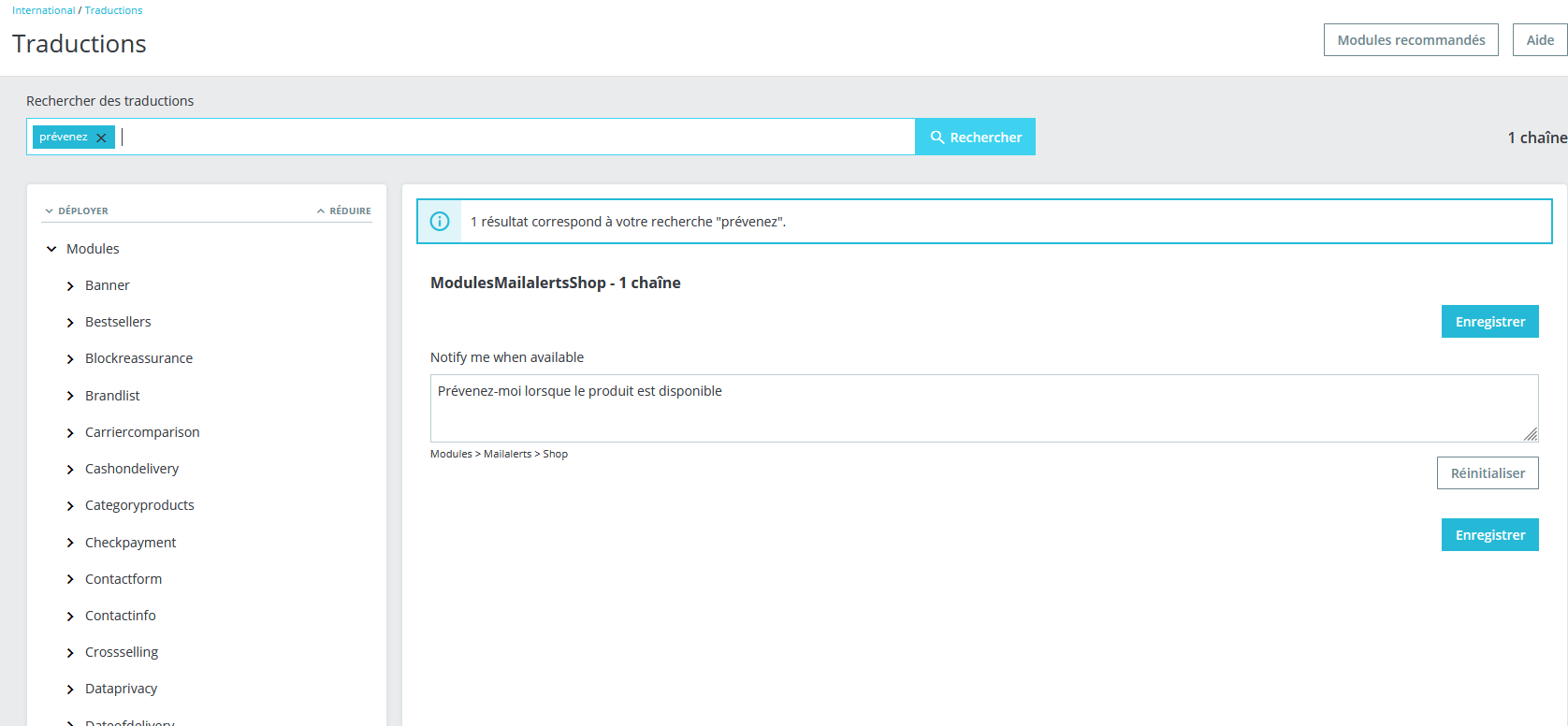 1Seb Posted June 21, 2021 Share Posted June 21, 2021 Bonjour, Allez dans : International > Traductions Ensuite mettre : Type de traduction : Traductions des modules installés Choisissez votre module : Mail alertes Choisissez votre langue : Français (French) Puis cliquez sur Modifier Dans Rechercher des traductions tapez : Prévenez-moi lorsque le produit est disponible Modifiez la traduction puis cliquez sur Enregistrer Sinon la traduction se trouve dans \translations\fr-FR\ModulesMailalertsShop.fr-FR.xlf Bonne journée, Seb Link to comment Share on other sites More sharing options...