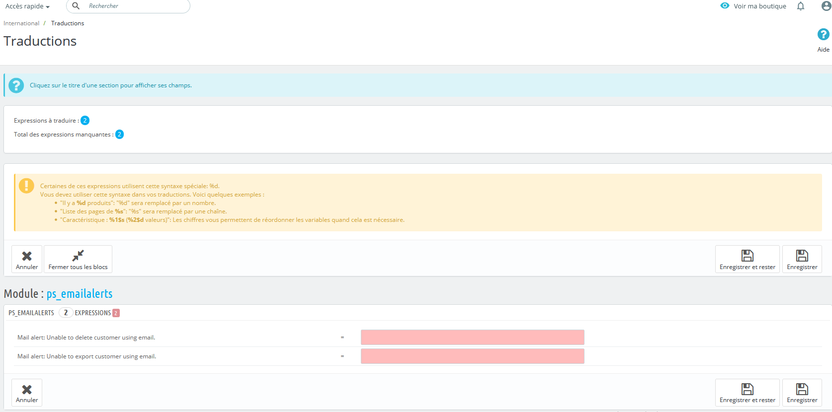 Steph13 Posted June 25, 2021 Share Posted June 25, 2021 2 hours ago, Shonen said: Méa culpa, cette capture d'écran me faisait cruellement penser à un 1.6 ! Je ne savais pas que les trads sous 1.7 pouvaient ressembler à ça. Pas de soucis 4 hours ago, 1Seb said: Bonjour, Regardez dans : International > Traductions Ensuite mettre : Type de traduction : Traductions de thème Sélectionnez votre thème : Votre thème Choisissez votre langue : Français (French) Puis cliquez sur Modifier Dans Rechercher des traductions tapez : Prévenez-moi lorsque le produit est disponible Modifiez la traduction puis cliquez sur Enregistrer Bonne journée, Seb Super ça a fonctionné ! Merci ! Link to comment Share on other sites More sharing options...