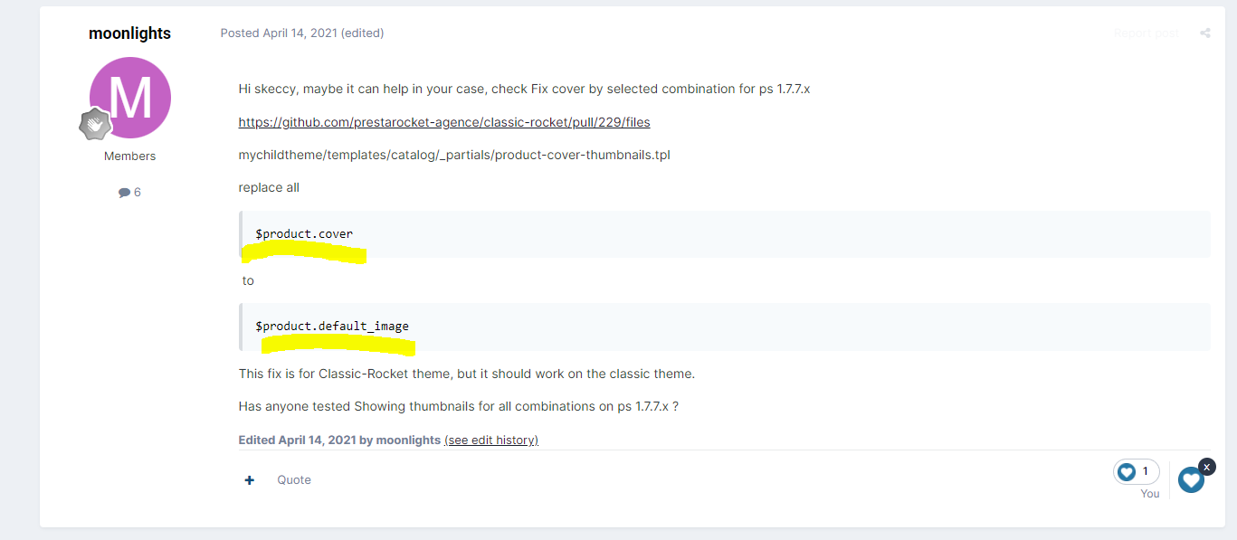 dtwfung Posted September 17, 2019 Share Posted September 17, 2019 On 9/14/2019 at 3:48 PM, dtwfung said: Same issue with 1.7.6.1. Few pictures uploaded for a product with combination, those pictures can review in BO. But, only one picture showing in FO. can you help me please? I fixed mine. Not sure if this caused by the 1-click upgrade. Mine system was upgraded from 1.6 to 1.7.5.1 using Native upgrade. The cover column of image and image-shop table did not change to NULLable. When insert new image, it has two image ID... I found out from a native 1.7.5.1 installation. Link to comment Share on other sites More sharing options...