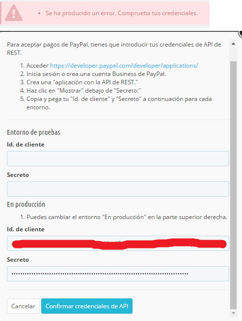 CarlosRR Posted April 6, 2017 Author Share Posted April 6, 2017 Según leí ayer el módulo oficial ya es compatible con PS 1.7. Muchas gracias por tu contestacion, pero tengo un grave problema a la hora de configurar paypal, ¿serias tan amable de ver si puedes ayudarme? Adjunto imagen con el error que me da a la hora de configurar paypal. Un saludo y espero su respuesta muchas gracias Link to comment Share on other sites More sharing options...