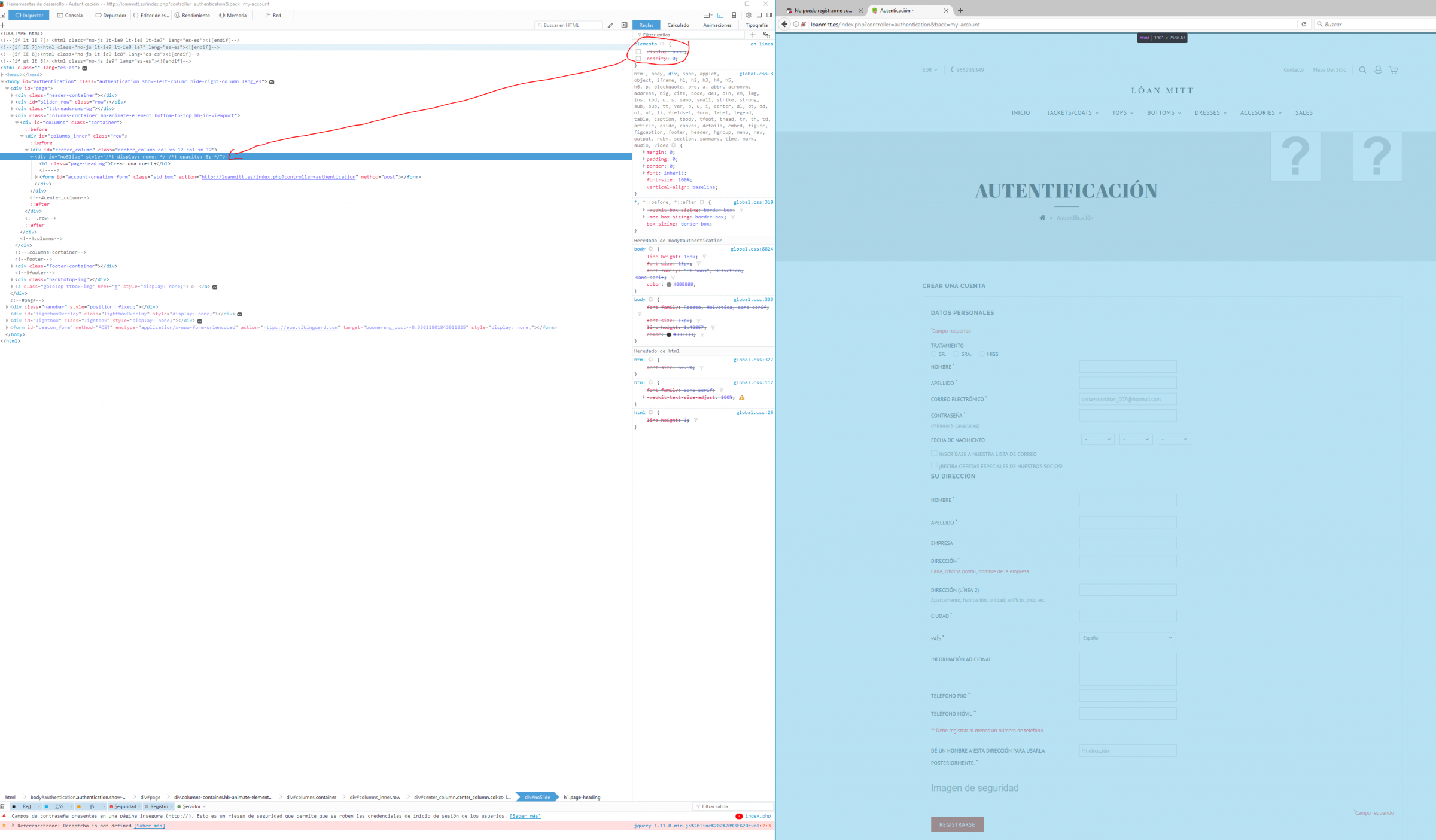 mAchAcA Posted April 21, 2017 Share Posted April 21, 2017 Buenas de nuevo!!!! No te metas con prestashop que va deluxe!!! Tu problema es básicamente de la plantilla, o de la configuración de la misma. Por consiguiente, si no tienes conocimento de css, html y php deberías contactar con el vendedor de la misma para solucionar los problemas. Te adjunto un ejemplo: Quitando dos líneas de css nada más ya sale el login. Link to comment Share on other sites More sharing options...