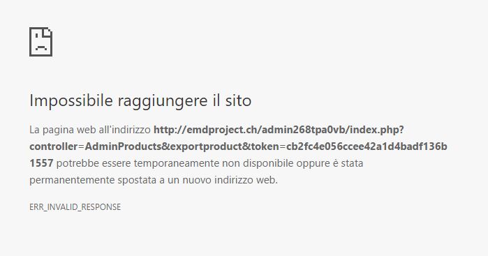 assistenzaemd Posted April 6, 2017 Share Posted April 6, 2017 Ciao, ho un problema quando cerco di esportare i prodotti: Catalogo->Prodotti->ESPORTA Dopo qualche secondo di caricamento mi esce una pagina con questo errore Ci tengo a precisare: - la mia versione di Prestashop: 1.6.1.11 - ho già provato il fix consigliato qui: https://github.com/PrestaShop/PrestaShop/commit/006dcbee13a492d0cad566dc9ea634e100fc8b00 Link to comment Share on other sites More sharing options...