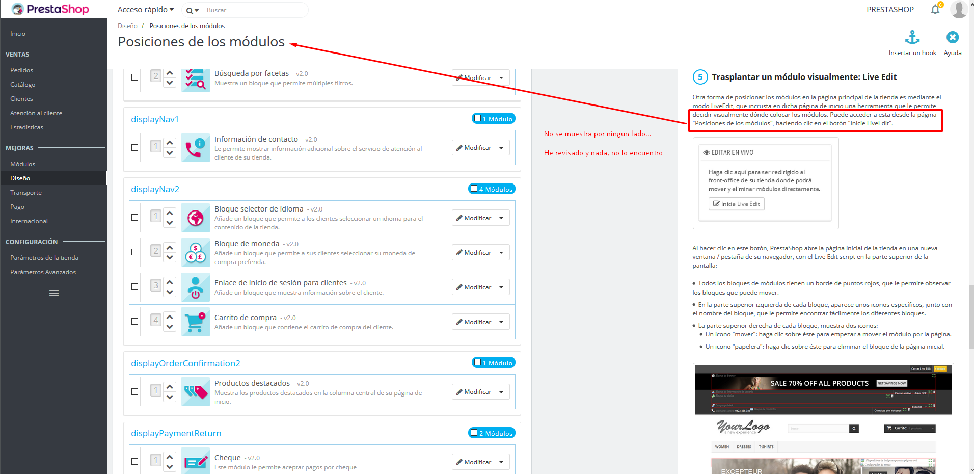 joseantgv Posted April 7, 2017 Share Posted April 7, 2017 Alguien sabe como activar el Live Editor en Prestashop v1.7? Por mas que busco no lo encuentro. Agradecere mucho por su ayuda De momento no está habilitada para PS 1.7. 1 Link to comment Share on other sites More sharing options...