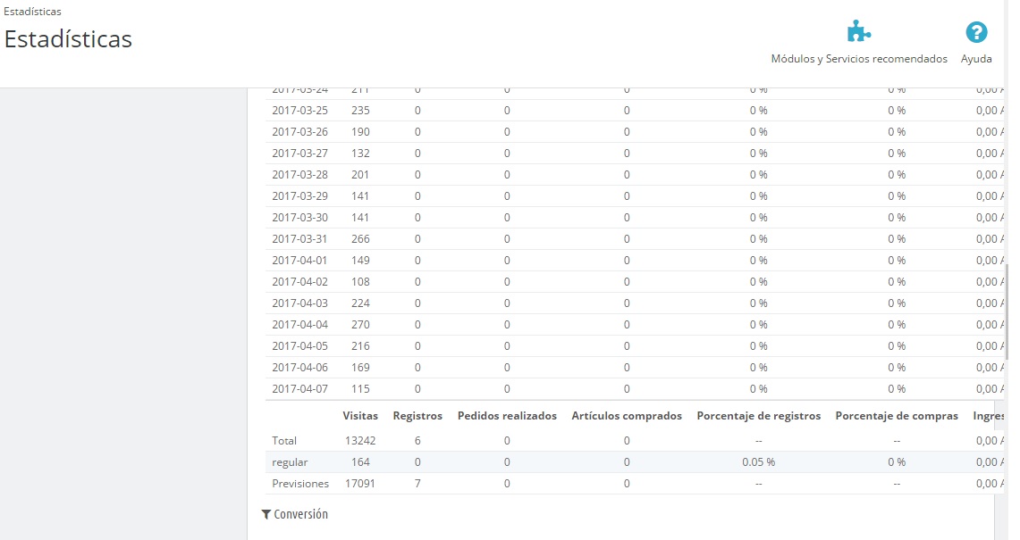 grusso Posted April 7, 2017 Share Posted April 7, 2017 (edited) Buen dia amigos De repente, asi, me han desaparecido las estadísticas de visitas y compras al sitio desde la opcion de menú inicio. Me aparece todo en cero. Ahora bien, si voy a estadisticas>estadisticas me aparecen los visitantes y ventas y todo Ahora bien, mi consulta es: ¿Cómo hago para que en inicio pueda ver el grafico de visitantes y ventas y todo eso? Queda de mas indicar que quise una y mil veces instalar Google Analytics y siempre he fracasado. Gracias de antemano, a quien puede echar una mano Edited April 7, 2017 by grusso (see edit history) Link to comment Share on other sites More sharing options...