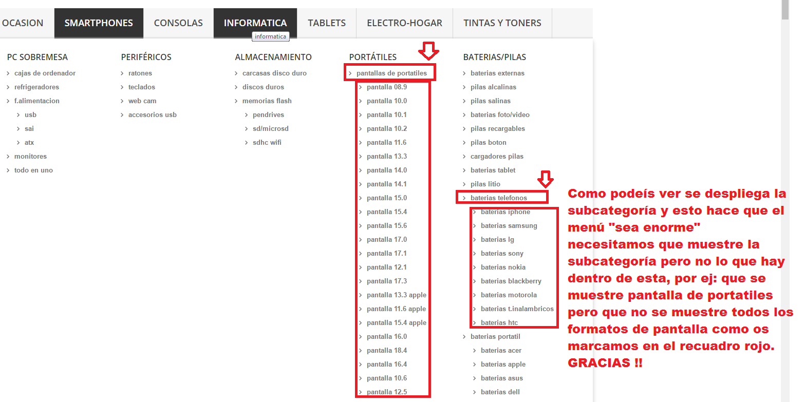 multioca Posted April 8, 2017 Share Posted April 8, 2017 Hola comunidad. Tenemos una duda sobre el menú, ya que muestra además de las categóricas y subcategorias lo que hay dentro de las subcategorías. Nosotros queremos que se muestren la categorías y subcategorías pero no lo que hay dentro de la subcategoría. Os adjuntamos una imagen y explicación con lo que nos pasa. Gracias, saludos Link to comment Share on other sites More sharing options...