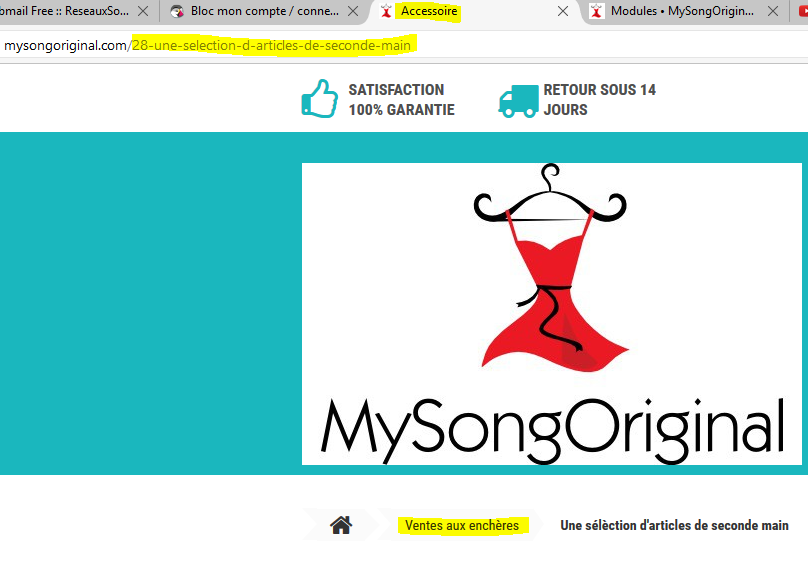 mysongoriginal Posted April 9, 2017 Author Share Posted April 9, 2017 Ahhh je viens de trouver l'erreur....Heleluja.... la dernière catégorie est inaccessible, je ne sais pas pourquoi, alors prestashop l'affecte par défaut à la dernière catégorie accessible ... Comment je fais pour que la catégorie souhaité soit accessible...Merci (screenshot) Salutations, SOSO Link to comment Share on other sites More sharing options...