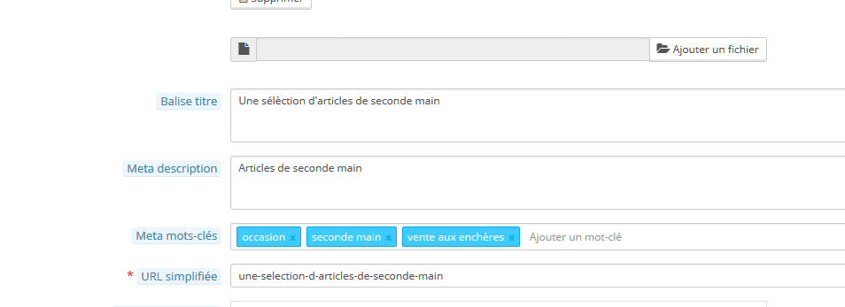 Mediacom87 Posted April 9, 2017 Share Posted April 9, 2017 Bonjour, Dans la configuration de la catégorie vous avez le titre, puis l'url simplifiée et enfin le meta title pour la fenêtre et les moteurs de recherche. 1 Link to comment Share on other sites More sharing options...
