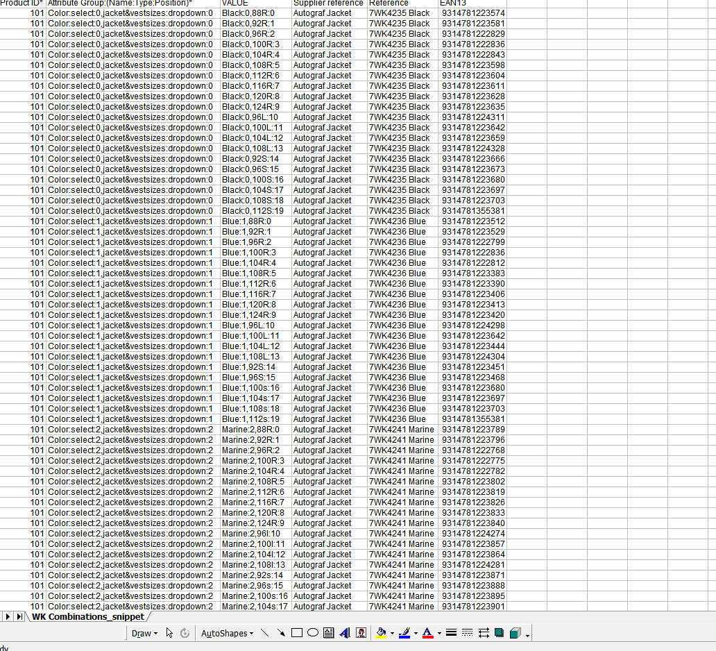 JeredBolton Posted April 12, 2017 Share Posted April 12, 2017 Here's a version of your sample that I've extended to include another colour: Product ID*,Attribute Group:(Name:Type:Position)*,Value:Position,Supplier reference,Reference,EAN13,Quantity,Minimal quantity,Default (0 = No; 1 = Yes)8, Color:color:0; Jacket & Vest Sizes:select:1, Black:0;100L:1,Autograf Jacket,7WK4235 Black ,9314781223642,3,3,08, Color:color:0; Jacket & Vest Sizes:select:1, Black:0;100R:1,Autograf Jacket,7WK4236 Black ,9314781222836,3,3,08, Color:color:0; Jacket & Vest Sizes:select:1, Black:0;100S:1,Autograf Jacket,7WK4237 Black ,9314781223680,3,3,08, Color:color:0; Jacket & Vest Sizes:select:1, Black:0;104L:1,Autograf Jacket,7WK4238 Black ,9314781223659,3,3,08, Color:color:0; Jacket & Vest Sizes:select:1, Black:0;104R:1,Autograf Jacket,7WK4239 Black ,9314781222843,3,3,08, Color:color:1; Jacket & Vest Sizes:select:1, Pink:1;100L:1,Autograf Jacket,7WK5235 Pink ,8314781223642,3,3,08, Color:color:1; Jacket & Vest Sizes:select:1, Pink:1;100R:1,Autograf Jacket,7WK5236 Pink ,8314781222836,3,3,08, Color:color:1; Jacket & Vest Sizes:select:1, Pink:1;100S:1,Autograf Jacket,7WK5237 Pink ,8314781223680,3,3,08, Color:color:1; Jacket & Vest Sizes:select:1, Pink:1;104L:1,Autograf Jacket,7WK5238 Pink ,8314781223659,3,3,08, Color:color:1; Jacket & Vest Sizes:select:1, Pink:1;104R:1,Autograf Jacket,7WK5239 Pink ,8314781222843,3,3,0 A few observations: You have to spell color the American (incorrect) way, otherwise prestashop doesn't pick up the off-the-shelf Color Attributes.You could create your own Product Attributes called Colour and define each colour yourself, but it makes sense to pick up the existing ones. I've kept the Position value simple, 0 or 1. I've made the Reference unique. In your example all combinations have the same reference (7WK4235 Black) which is why you're only getting one of each colour group. Link to comment Share on other sites More sharing options...