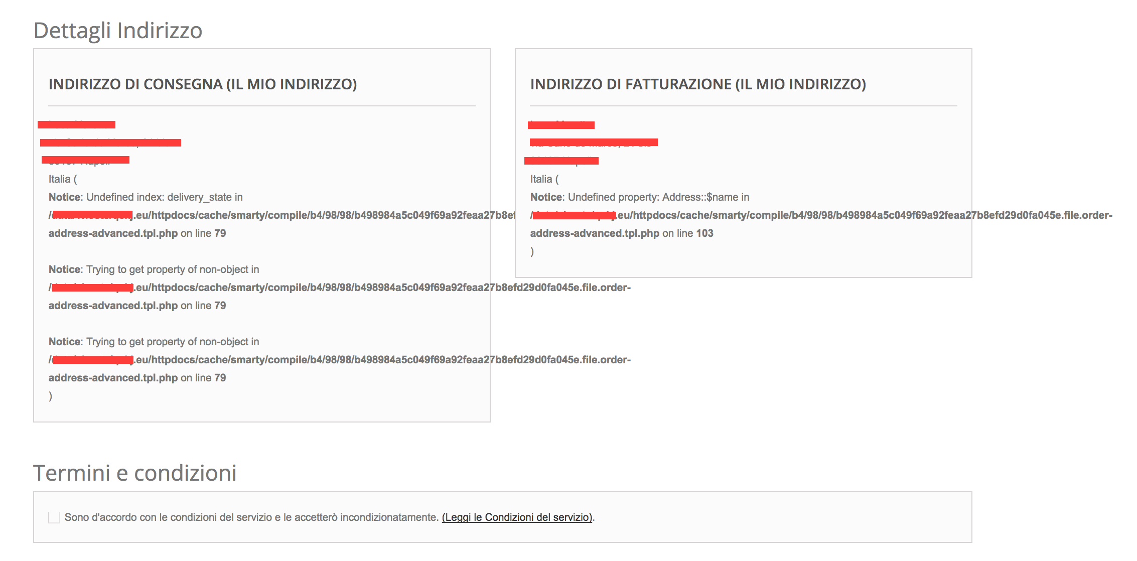 alb.syn Posted April 16, 2017 Share Posted April 16, 2017 (edited) Salve e buona Pasqua a tutti, sto impostando un negozio con Prestashop 1.6.11. La registrazione dei clienti è impostata su "Standard" e con "CheckOut Rapido". Durante delle prove, inserendo i dati di registrazione e aver cliccato sul pulsante "Salve" che compare alla fine del blocco della registrazione utente, mi compaiono a video tutta una serie di errori che non riesco a comprendere. La registrazione, comunque, va a buon fine: arrivano correttamente le email predefinite all'indirizzo indicato e l'utente appare nel backoffice. Ma la comparsa di tutti quelli errori non è carino. Allego screenshot con gli errori. Avete idea di come risolvere? Grazie a tutti. Alb Edited April 16, 2017 by alb.synapsis (see edit history) Link to comment Share on other sites More sharing options...