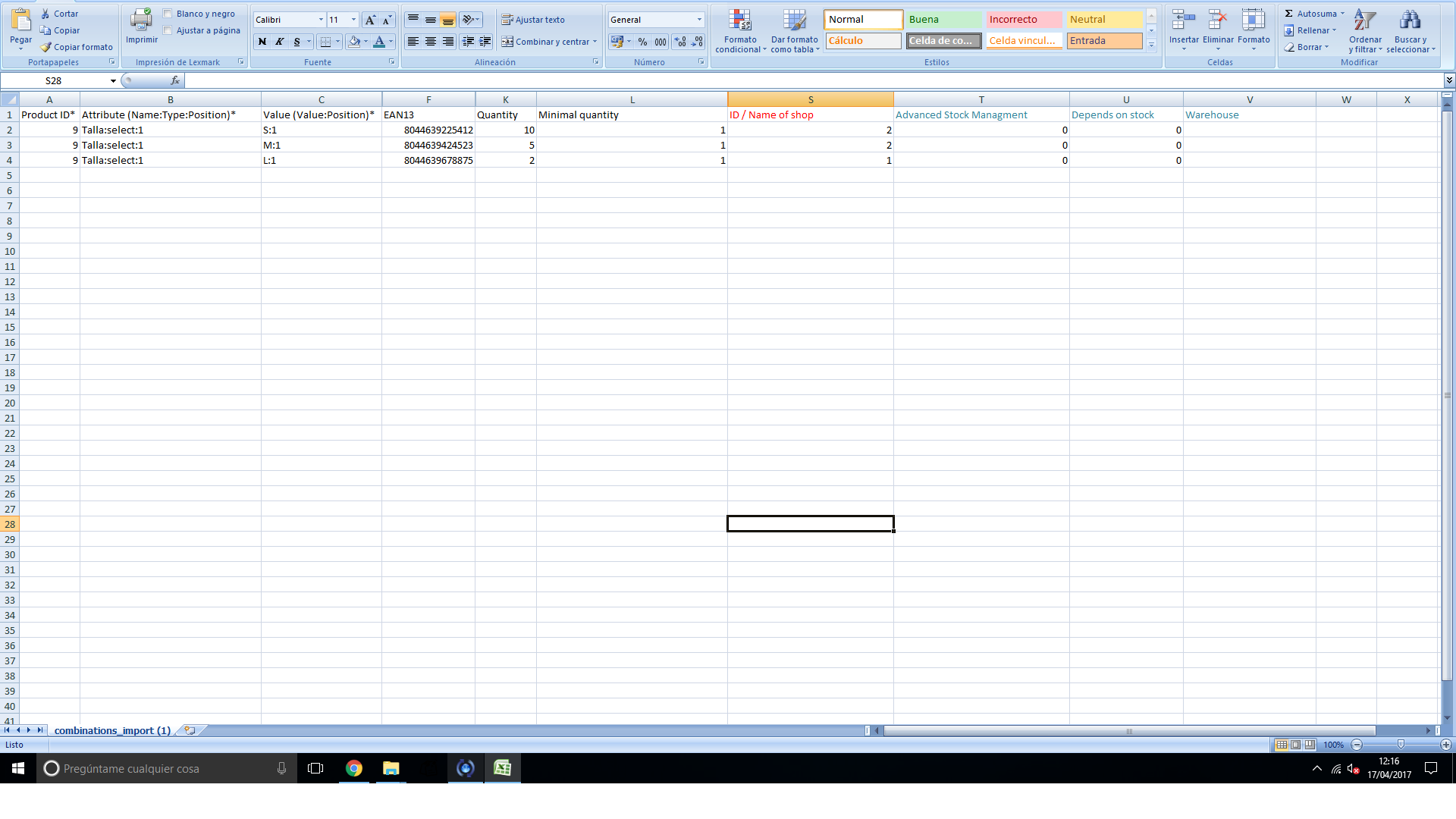 Nagore_A Posted April 17, 2017 Share Posted April 17, 2017 Buenas a tod@s Estoy intentando importar un excel de combinaciones para subir las diferentes tallas y unidades de los productos. La plantilla me la he descargado directamente de Prestashop. Hasta ahora lo único que he conseguido es subir un stock general que se me añade en todas las tiendas. El problema está en que cada tienda debería tener su propio stock, pero no hay manera. Hay una celda para poder poner el Id de la tienda (ID/Name of shop) a la que quieres añadir el producto con su stock, pero lo he probado varias veces y no me funciona. No se qué estoy haciendo mal. Las importaciones las estoy haciendo desde "todas las tiendas", y el Id de la tienda lo he sacado de "Parámetros avanzados - multitienda". Por otro lado estoy ignorando las siguientes tres celdas del excel, y no se si puede ser ese el error (Advanced Stock Managment, Depends on stock y Wharehouse). Probé también a añadir el Id del almacén para ver si me añadía el stock en un sólo almacén pero me dio error. La verdad que soy nueva en estoy y me estoy volviendo loca. Si me pudierais ayudar.. muchas gracias Link to comment Share on other sites More sharing options...