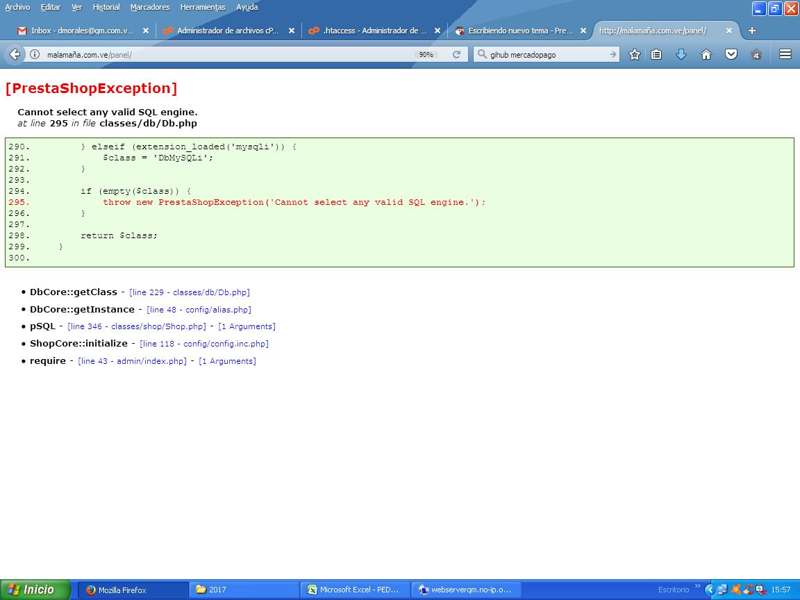 mala maña Posted April 18, 2017 Share Posted April 18, 2017 Buenas hola a todos Estoy intentando entrar al panel de prestashop y me aparece el siguiente error, no carga ni la pagina, ni el panel. Alguien que me pueda aydudar links: www.malamaña.com.ve/panel Este es el error: [PrestaShopException]Cannot select any valid SQL engine.at line 295 in file classes/db/Db.php 290. } elseif (extension_loaded('mysqli')) {291. $class = 'DbMySQLi';292. }293. 294. if (empty($class)) {295. throw new PrestaShopException('Cannot select any valid SQL engine.');296. }297. 298. return $class;299. }300. DbCore::getClass - [line 229 - classes/db/Db.php] DbCore::getInstance - [line 48 - config/alias.php] pSQL - [line 346 - classes/shop/Shop.php] - [1 Arguments] ShopCore::initialize - [line 118 - config/config.inc.php] require - [line 43 - admin/index.php] - [1 Arguments] Link to comment Share on other sites More sharing options...
