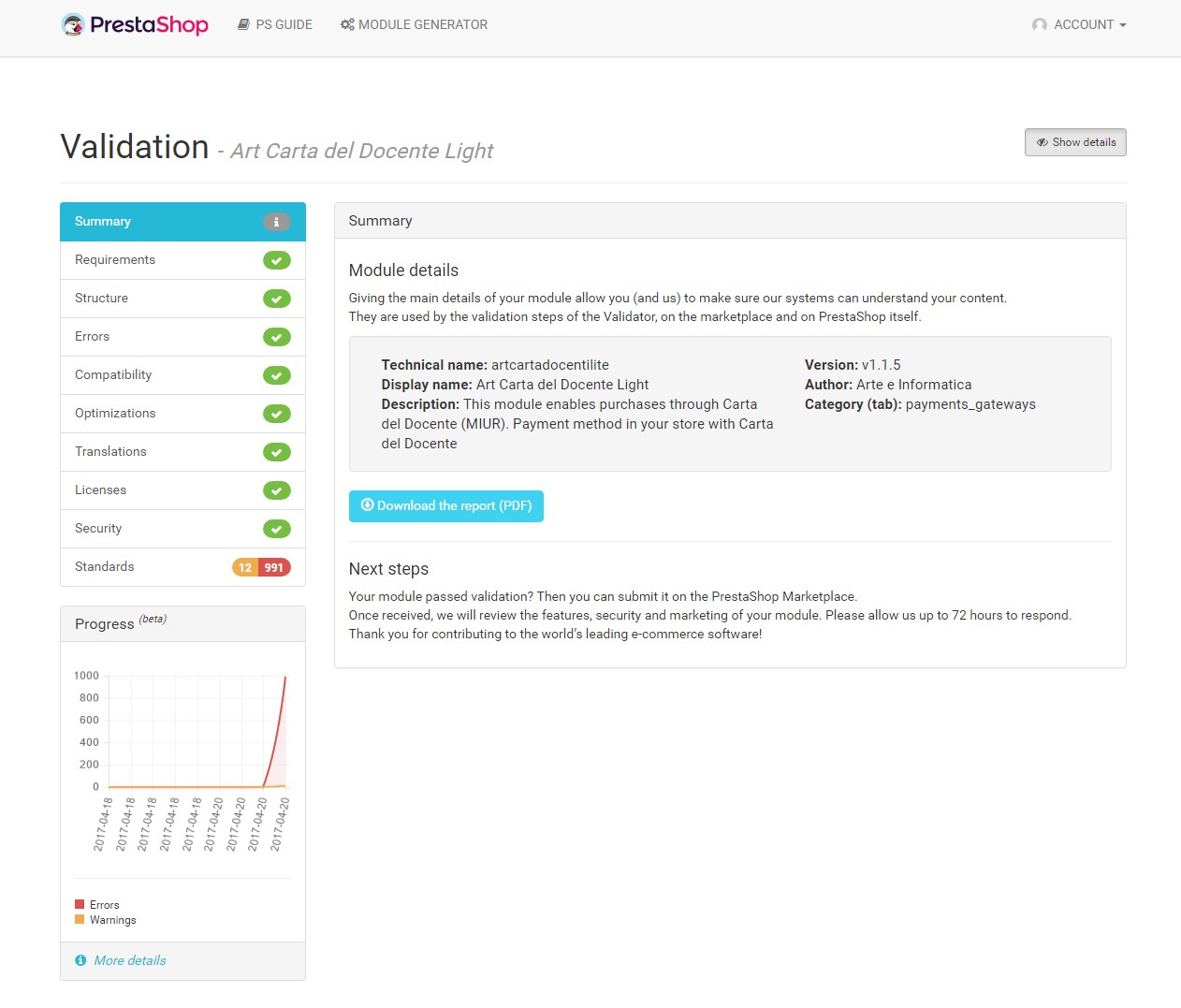 Arteinfo Posted April 20, 2017 Share Posted April 20, 2017 (edited) Sto provando a pubblicare su PrestaSho Addons i nostri moduli per ricevere i pagamenti con Carta del Docente e 18app, una volta inviato il file ricevo dalla procedura automatica dopo un po' di tempo il seguente messaggio:"The use of smarty templates is mandatory to display HTML. Your PHP code should not contain HTML." Validando il modulo tramite: https://validator.prestashop.com il modulo risulta corretto. Ho vagliato ogni riga di codice, ma non trovo quanto segnalano, l'unica cosa che mi viene in mente sono le seguenti righe di codice: if (!$authorized) die($this->module->l('This payment method is not available.', 'validation')); In \controller\front\validation.php Che comunque anche nel modulo Bankwire di PrestaShop eseguono così. Edited April 20, 2017 by Arteinfo (see edit history) Link to comment Share on other sites More sharing options...