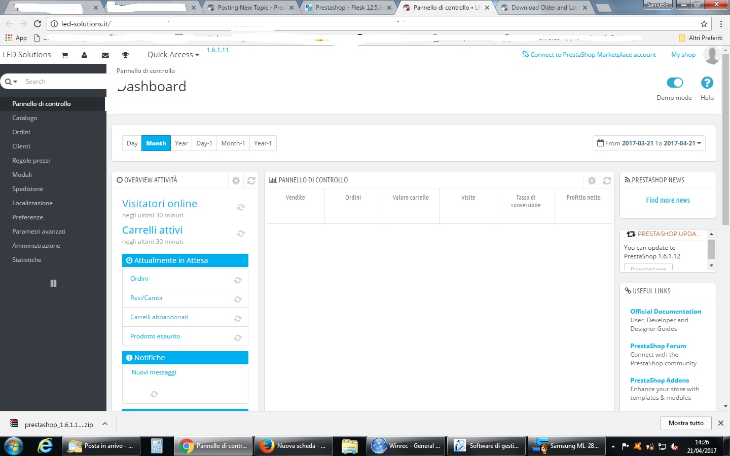gisco62 Posted September 2, 2017 Share Posted September 2, 2017 Buongiorno sulla stessa versione di prestashop 1.6.1.11 ho lo stesso problema che descrivi nella foto la dashboard della home nel backoffice non visualizza piu i grafici e il pannello sinistro OVERVIEW ATTIVITA carica in continuazione senza mostrare dati per il resto fuziona tutto utilizzo CROME Versione 60.0.3112.113 come Browswer anche utilizzando Internet explorer non cambia niente Questo problema e comparso dopo aver aggiornato la versione PHP alla 7.1 sul pannello di controllo del mio dominio in precedenza funzionava perfettamente era attiva la versione PHP 5.6 Grazie Link to comment Share on other sites More sharing options...
