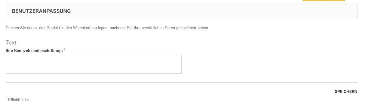 Ich würde gerne den Bereich Benutzeranpassung bei den Produktdetails etwas modifizieren. Und zwar die Zeile "Benutzeranpassung und "Text" wie im Anhang ersichtlich entfernen und das Feld "Ihre Kennzeichenbschriftung" zum Einen mit der Schriftart Euro Plate belegen und wenn möglich ein Kennzeichenbild in den Hintergrund legen. Bekommt man das ohne allzu großen Aufwand hin?