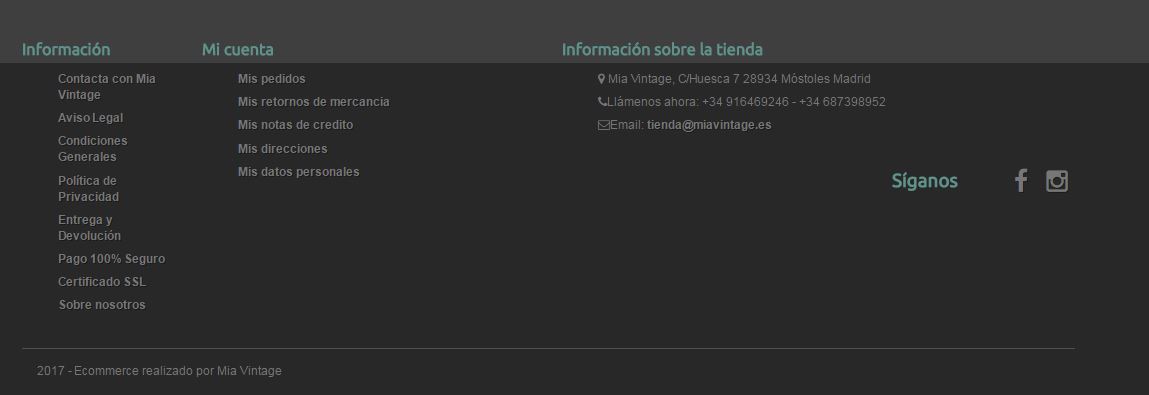 nadie Posted April 23, 2017 Share Posted April 23, 2017 Muchisimas gracias! He hecho todo lo que me has dicho excepto añadir categorias al displayfooter pues no quiero que aparezca abajo. He limpiado cache, pero aún no veo lo del nav correctamente, el pie de pagina ya lo veo perfecto. Tu ves bien ya el nav? Me lié esta tarde a meter margenes en todos los css que me has dicho al ver que se habia desconfigurado y cuando he visto que no volvía en si, he decidido escribir en el foro, es la primera vez que pido ayuda jaja muchisimas gracias por las molestias. Es mi primera web con prestashop, y aun me queda pulir muchas cosillas. Solo una cosa, sabes como reducir el margen de subcategorias? de todo el displayfooter asi como del modulo categorias? Muchas gracias de nuevo La cabecera la veo mas o menos bien, te falta alinear bien el iniciar sesion,esto: Aqui: https://miavintage.es/themes/default-bootstrap/css/modules/blockuserinfo/blockuserinfo.css Cambia ahora .header_user_info a { color: #5f928b; font-weight: bold; display: block; padding: 5px 5px 5px 5px; cursor: pointer; line-height: 18px; } por .header_user_info a { color: #5f928b; font-weight: bold; display: block; padding: 9px 9px 11px 8px; cursor: pointer; line-height: 18px; } ¿Has limpiado la cache de tu propio navegador, tras tocar las hojas de estilo? Link to comment Share on other sites More sharing options...