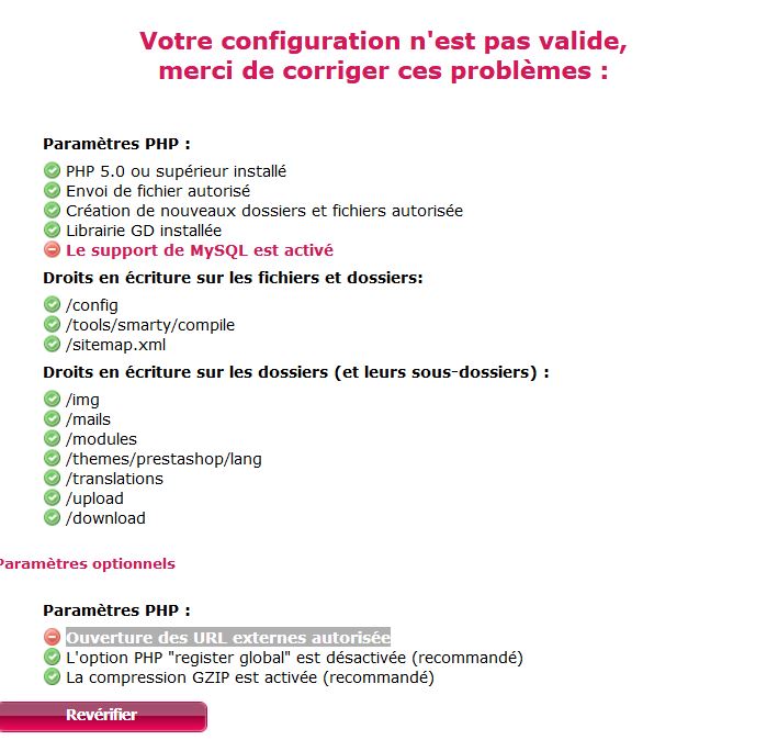 chris13009 Posted April 24, 2017 Share Posted April 24, 2017 Bonjour, Suite à des problèmes de connexion (page blanche en front et back office) résultant d'un problème de config, j'ai voulu réinstaller prestashop. Mais je suis bloqué par ces 2 messages en rouge (voir pièce jointe): - support de MySQL est activé - Ouverture des URL externes autorisée J'ai beau chercher je n'arrive pas à corriger ces 2 problèmes. Quelqu'un peut-il m'aider? Un grand merci par avance Link to comment Share on other sites More sharing options...