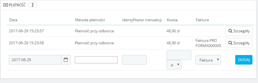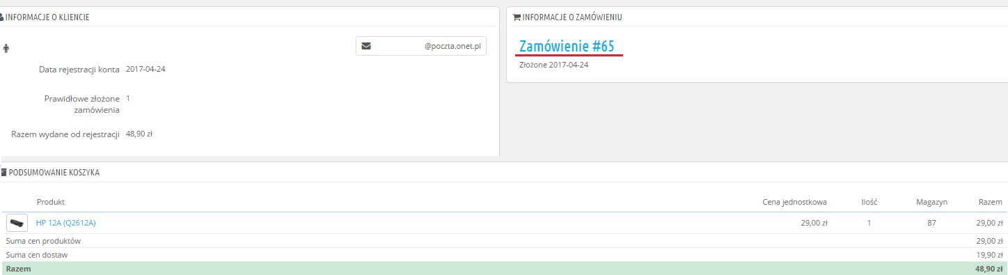 Wyświetla się poprawnie tylko kwota do zapłaty i stan zamówienia.