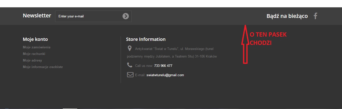 Mam mały problem ze zmianą koloru górnego paska (tam gdzie jest newsletter i facebook) w stopce szablonu domyślnego. Wiem jak zmienić kolor tła całej stopki, ale chciałbym również zmienić kolor właśnie tego wąskiego paska. Nie mogę znaleźć linijki kodu, która za to odpowiada w global.css. Bardzo proszę o pomoc. Wrzucam screen, na którym dokładnie widać o co mi chodzi.