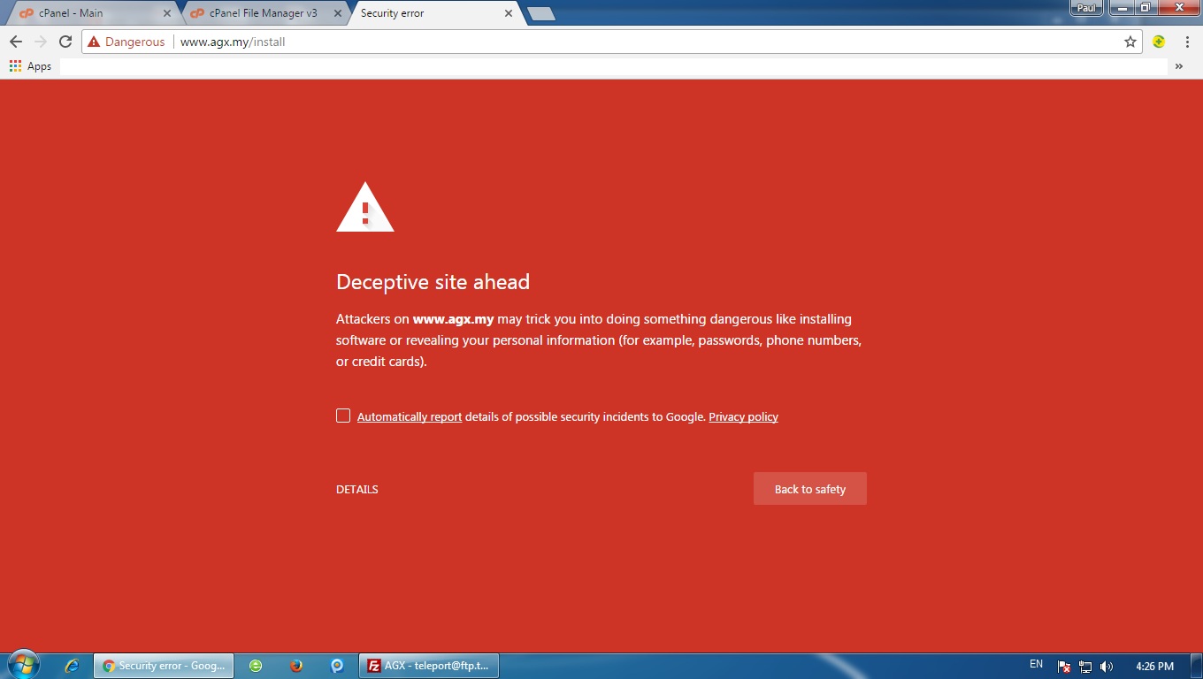 ladivito Posted April 30, 2017 Share Posted April 30, 2017 Hi, my website www.agx.my i upload all the prestashop 1.6 files to the server and try to install www.agx.my/install but it show the dangerous page as below. im using google chrome/firefox anyone have any idea to solve this please help. Thanks Link to comment Share on other sites More sharing options...