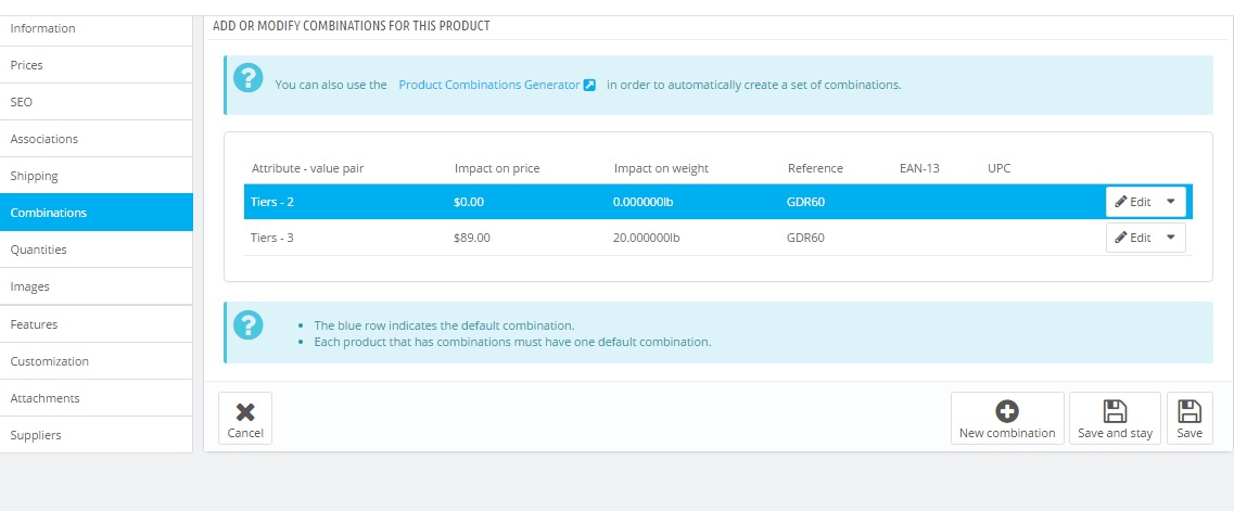 TurkeyFish Posted May 3, 2017 Share Posted May 3, 2017 I'm trying to do the simplest possible thing you can think of with combinations: Adding a single dropdown to a product, with 2 possible values. I've spent all day reading through a dozen threads here, reading through the section in the Prestashop documentation several times, and clicked through every option I can find in the attributes and products pages. I have one attribute named Tier, a dropdown list. I have two values for it, 2 and 3. I try adding the combinations in the product, and I get the error "You can only add one combination per attribute type". What does that mean? Isn't this the whole point of a dropdown, to have the user select a value for the attribute?? So maybe I'm misunderstanding the entire system. I go to Product Combinations Generator, add values 2 and 3, changing the impact on the product price for value 3 to $89. I enter 1000 for default quantity. I click Generate Combinations. It successfully saves, but then I go to the front end, reload the product page, and the attributes are showing but selecting 3 does not affect the attribute price. I even added it to the cart. It's still showing only the base price. What am I not understanding? Link to comment Share on other sites More sharing options...