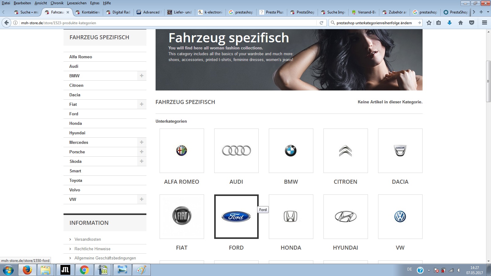 msh-store Posted May 7, 2017 Share Posted May 7, 2017 Hallo, bin grad am einrichten eines neuen Prestashops und plage mich mit einem kleinem Problemchen rum. Vielleicht sehe ich nur den Wald vor lauter Bäumen nicht Habe folgendes Problem : Die Unterkategorien werden nicht nach dem Namen sortiert dargestellt bzw. wie im angehängten Bild sichtbar > nur auf der linken Seite korrekt ( Ford-Honda-Hyundai-Mercedes ) und in der Hauptseite in der Reihenfolge wie bei erstellen (Ford-Honda-Hyundai-VW - usw.. ). Im Block Modul ist die Sortierung nach Name eingestellt und bei den Kategorien selbst kann ich nichts verschieben. Die Kategorien wurden über JTL Wawi Connector erstellt und hochgeladen > In der Wawi stimmen sie auch. Ist jemanden dieses Problembekannt und hätte einen Lösungsansatz ? Link to comment Share on other sites More sharing options...