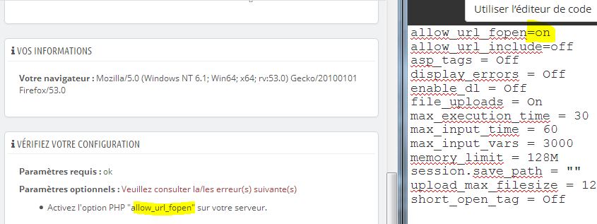 Hervé_Qc Posted May 9, 2017 Share Posted May 9, 2017 (edited) Bonjour, je viens de faire une nouvelle installation de PS 1.7.1.1 et j'ai les deux problèmes suivants: Vérifiez votre configurationParamètres requis : okParamètres optionnels : Veuillez consulter la/les erreur(s) suivante(s) Activez l'option PHP "allow_url_fopen" sur votre serveur. Cette option est pourtant activée ''On'' dans le fichier php.ini (/home/xxxx/etc/php.ini, et dans la racine du site PS). Ne voyant pas de changement dans le message d'erreur j'ai ajouté un autre fichier php.ini à la racine du site avec l'option. Rien n'y fait de même qu'avec le fichier htaccess : SetEnv ALLOW_URL_FOPEN 1 Le deuxième problème est ce message d'erreur lorsque je sélection les Modules: Cannot get catalog data, please try again later. Reason: Data from PrestaShop Addons is invalid, and cannot fallback on cache J'ai parcouru les messages du forum et les deux sujets semblent être liés, or tant que je n’arrive pas à régler le premier problème, le second existera aussi longtemps. Je me demande alors ce que je manque pour que l'option "allow_url_fopen" soit prise en compte. Quelqu'un a une idée ? Merci ! Edited May 9, 2017 by Hervé_Qc (see edit history) Link to comment Share on other sites More sharing options...
