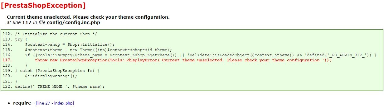 Skarlet Posted May 14, 2017 Share Posted May 14, 2017 (edited) Hola a todos Tengo es siguiente problema, ya me ha dado dos veces en dos instalaciones diferentes de PrestaShop Como consejo que he visto y oido de mas de uno aqui en la comunidad, me puse a duplicar la plantailla por default que viene, para ello me fui a Preferencia > Temas > Añadir Tema > CREAR UN TEMA NUEVO , en esta parte le di el nombre sencillo y todos los datos que pide y el tema de modelo, como lo dije antes en el tema que viene por defecto, Una vez que se creó, lo intente cargar y Sashhhh !!!! me salio el 500 Server Error, habilite el debug y me aparece lo siguiente [PrestaShopException] Current theme unselected. Please check your theme configuration.at line 117 in file config/config.inc.php 112. /* Initialize the current Shop */113. try {114. $context->shop = Shop::initialize();115. $context->theme = new Theme((int)$context->shop->id_theme);116. if ((Tools::isEmpty($theme_name = $context->shop->getTheme()) || !Validate::isLoadedObject($context->theme)) && !defined('_PS_ADMIN_DIR_')) {117. throw new PrestaShopException(Tools::displayError('Current theme unselected. Please check your theme configuration.'));118. }119. } catch (PrestaShopException $e) {120. $e->displayMessage();121. }122. define('_THEME_NAME_', $theme_name); require - [line 27 - index.php] Me fui a ver el archivo config/config.inc.php en la linea 117 y me sale esto de la linea 112 a la 121 /* Initialize the current Shop */ try { $context->shop = Shop::initialize(); $context->theme = new Theme((int)$context->shop->id_theme); if ((Tools::isEmpty($theme_name = $context->shop->getTheme()) || !Validate::isLoadedObject($context->theme)) && !defined('_PS_ADMIN_DIR_')) { throw new PrestaShopException(Tools::displayError('Current theme unselected. Please check your theme configuration.')); } } catch (PrestaShopException $e) { $e->displayMessage(); } Pero ya no se que mas hacerle, Alguna idea de este error? Saludos. Uso la versión 1.6.1.13 Edited May 18, 2017 by Skarlet (see edit history) Link to comment Share on other sites More sharing options...