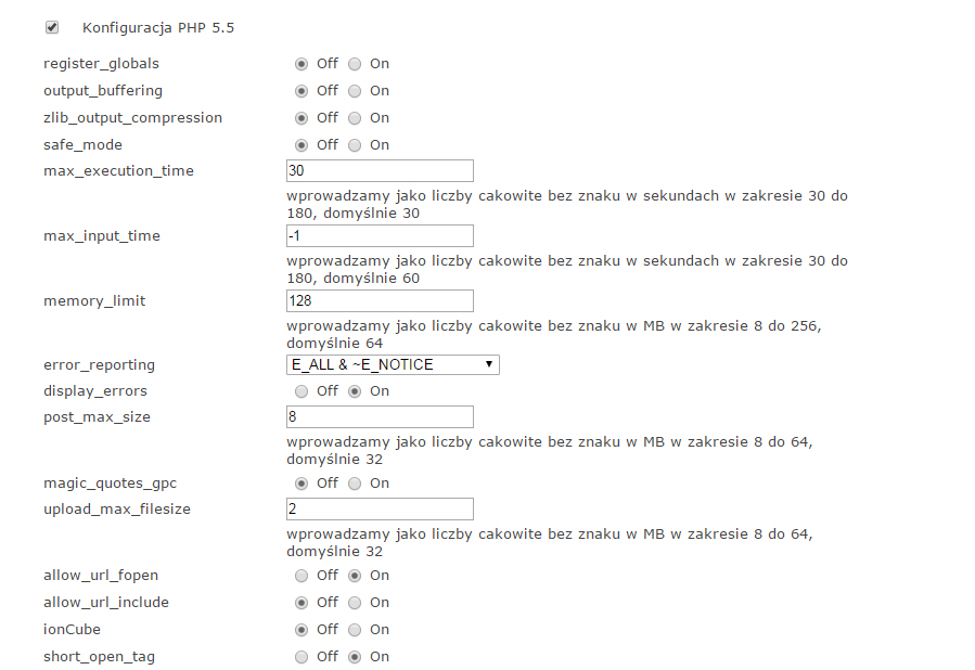 magisterson Posted May 16, 2017 Author Share Posted May 16, 2017 (edited) Nie można się dogadać z tymi ludźmi od hostingu. Sklep jest postawiony na OGICOM, przez FTP nie ma dostępu do logów, a przez php.ini nie mogę tego włączyć. Można tylko zmieniać ustawienia php.ini za pomocą panelu admina na OGICOM, ale tam nie ma wszystkich opcji dostępnych jak widać na załączonym obrazku. Ręce opadają. Ja ich proszę o informacje gdzie podejrzeć logi serwera a oni mnie odsyłają do ustawień aby włączyć sobie error_reporting co nic mi nie daje :/ Edited May 16, 2017 by magisterson (see edit history) Link to comment Share on other sites More sharing options...