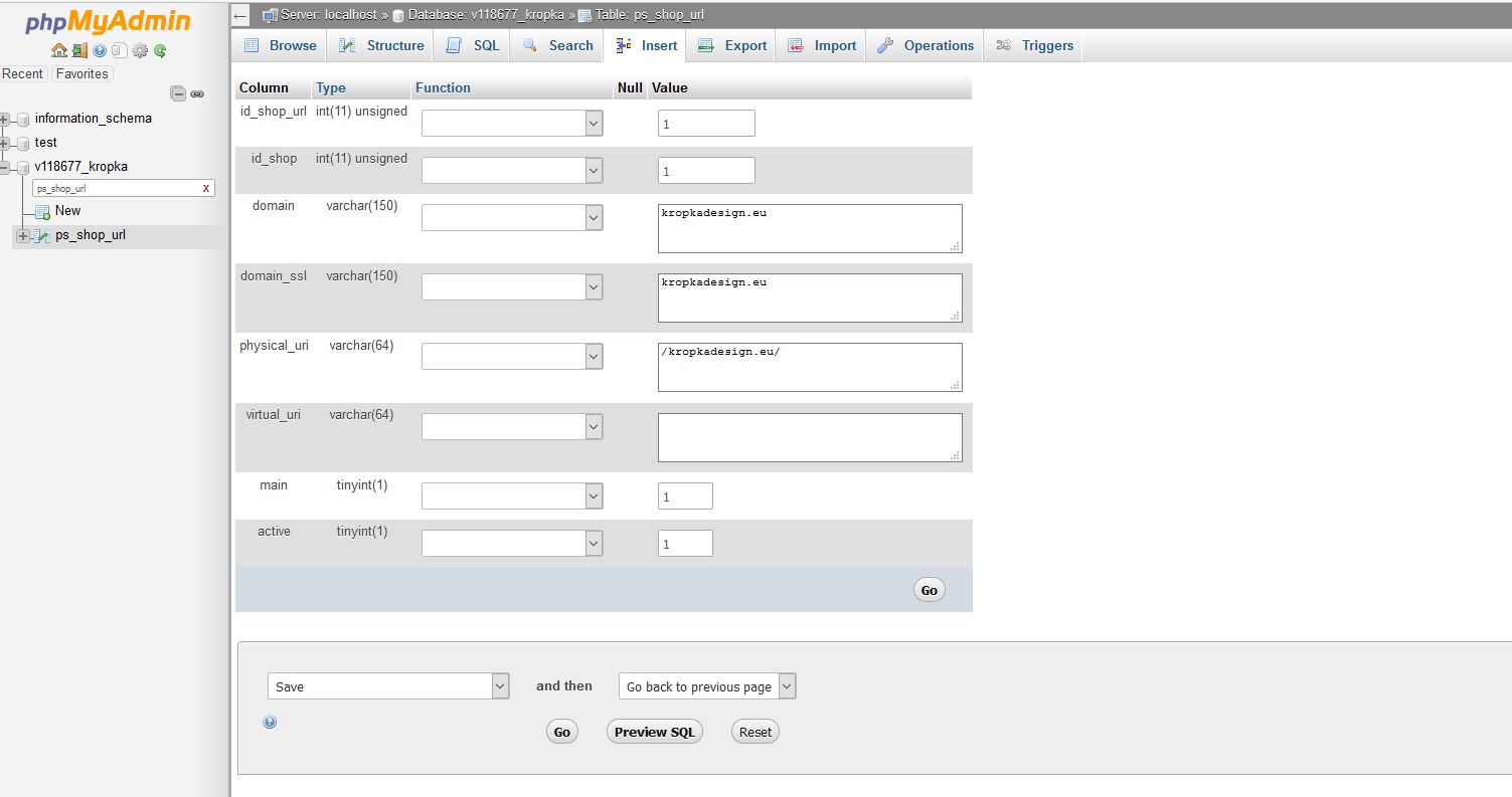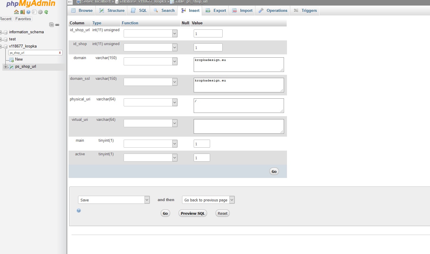 0 Piotr K. Posted May 17, 2017 Share Posted May 17, 2017 a bazę widzisz i możesz do niej wejść? jeśli tak to po wejściu w bazę wybierz u góry SQl i wstaw tam kod DROP TABLE IF EXISTS `ps_shop_url`; CREATE TABLE IF NOT EXISTS `ps_shop_url` ( `id_shop_url` int(11) unsigned NOT NULL AUTO_INCREMENT, `id_shop` int(11) unsigned NOT NULL, `domain` varchar(150) NOT NULL, `domain_ssl` varchar(150) NOT NULL, `physical_uri` varchar(64) NOT NULL, `virtual_uri` varchar(64) NOT NULL, `main` tinyint(1) NOT NULL, `active` tinyint(1) NOT NULL, PRIMARY KEY (`id_shop_url`), UNIQUE KEY `full_shop_url` (`domain`,`physical_uri`,`virtual_uri`), UNIQUE KEY `full_shop_url_ssl` (`domain_ssl`,`physical_uri`,`virtual_uri`), KEY `id_shop` (`id_shop`) ) ENGINE=InnoDB DEFAULT CHARSET=utf8 AUTO_INCREMENT=2 ; INSERT INTO `ps_shop_url` (`id_shop_url`, `id_shop`, `domain`, `domain_ssl`, `physical_uri`, `virtual_uri`, `main`, `active`) VALUES (1, 1, 'kropkadesign.eu', 'kropkadesign.eu', '/', '', 1, 1); przed zatwierdzeniem może pokaż na forum Link to comment Share on other sites More sharing options...