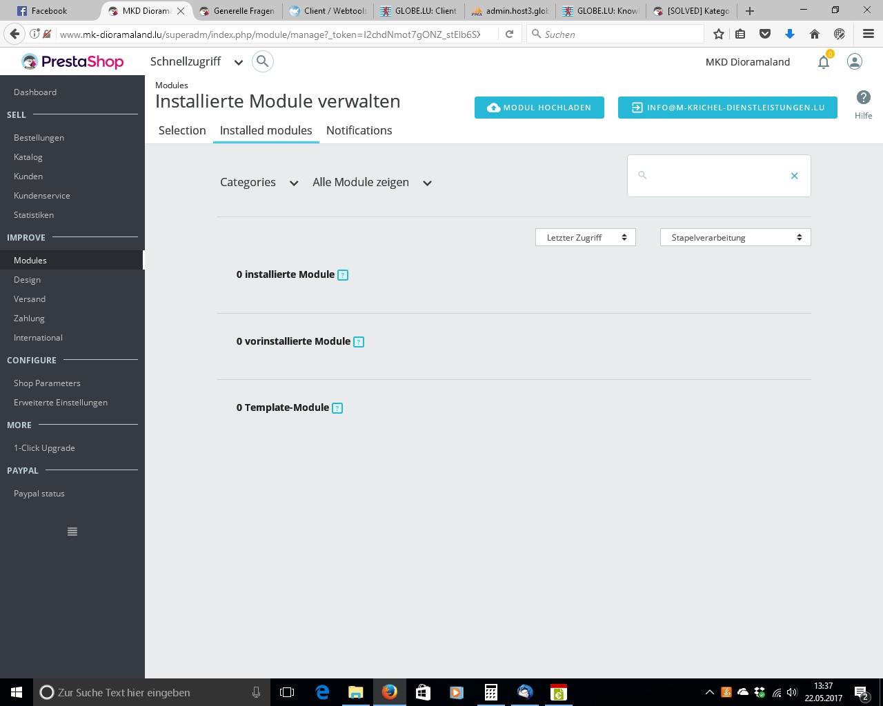 MK Dioramaland Posted May 22, 2017 Share Posted May 22, 2017 Hallo, nachdem ich seit letzter Woche keinen Zugriff mehr auf meinen Warenkorb und die Produkte habe (siehe alten Post https://www.prestashop.com/forums/topic/609964-warenkorb-und-produkte/), wollte ich heute auf Anweisung des Hosting Dienstes (Globe.lu welche auch von IHrer Seite aus keinen Fehler festestellen konnten) Das 1 Click Upgrade Modul installieren.Wenn ich auf Module gehe, erhalte ich das Bild aus dem Screenshot. Kann mir irgendwer helfen, daß ich wieder an meine Produkte im Backoffice komme und die Module wieder da sind? Link to comment Share on other sites More sharing options...