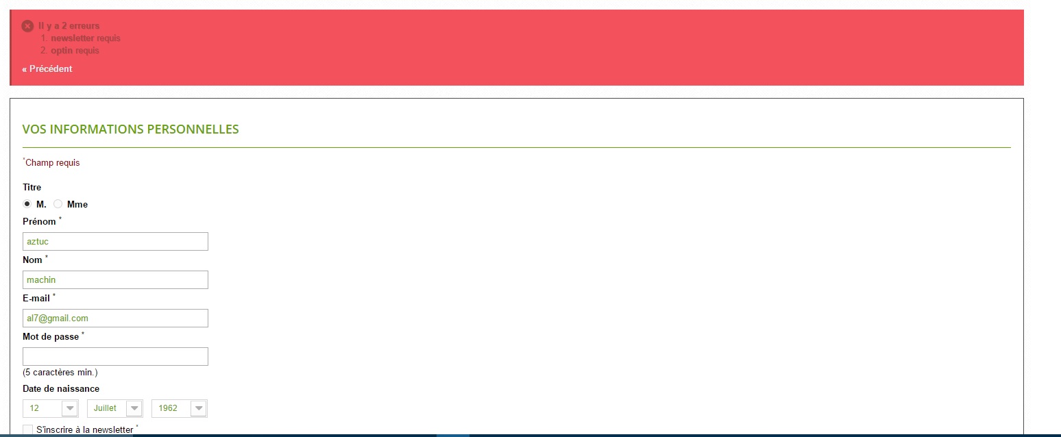 Alexandre Carette Posted May 25, 2017 Share Posted May 25, 2017 Salut, ligne 161 de ton iddentity.tpl de ton theme tu as ca ? {if isset($optin) && $optin} <div class="checkbox"> <label for="optin"> <input type="checkbox" name="optin" id="optin" value="1" {if isset($smarty.post.optin) && $smarty.post.optin == 1} checked="checked"{/if}/> {l s='Receive special offers from our partners!'} {if isset($required_fields) && array_key_exists('optin', $field_required)} <sup> *</sup> {/if} </label> </div> {/if} Link to comment Share on other sites More sharing options...