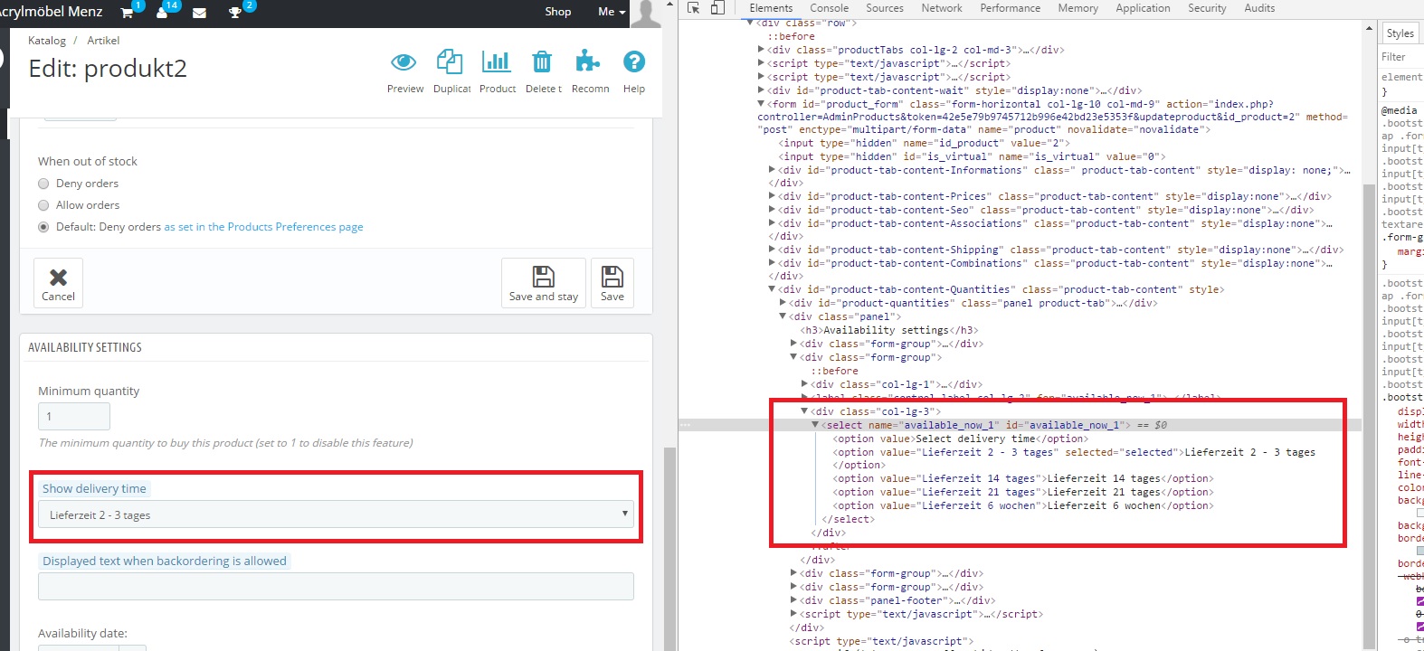 0 Whiley Posted May 24, 2017 Share Posted May 24, 2017 Hallo Freunde, ich habe wieder ein Problem, bin für jede Unterstützung dankbar. Ich möchte die Lieferzeit Angaben individualisieren. Auf dem Foto seht ihr die Lieferzeiten, die angelegt wurden. Nun möchte ich einer weitere Lieferzeit einfügen. Nur wie finde ich die richtige Datei auf dem FTP Server, wo der Eintrag zu finden ist. Lieber Grüße Ayhan So, dann beteilige ich mich auch am heiteren Berufe .. padon Dateiraten. Ich tippe drauf, das das option-field angelegt wurde in der Datei: \adminXXX\themes\default\template\controllers\products\quantities.tpl für adminXXX mußt du natürlich dein Administrationsverzeichnis, also daß das du aufruftst um dich im BO anzumelden, eintragen. Grüsse Whiley Link to comment Share on other sites More sharing options...