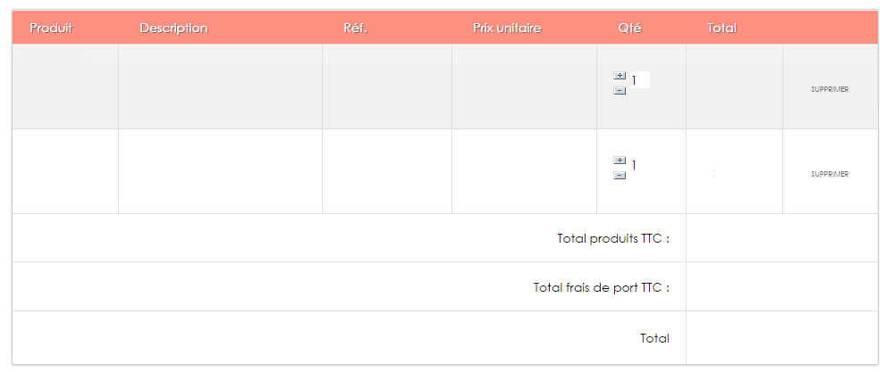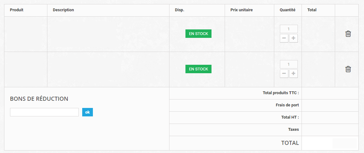 doys9487 Posted May 24, 2017 Share Posted May 24, 2017 Bonjour. J'ai acheté un thème qui ne possède pas de tableau récapitulatif dans mon panier : Cela m’embête car ce n'est pas vraiment ce que je veux pour mon panier. J'ai vainement essayé de prendre le tableau du thème de base "default-bootstrap" mais cela ne donne rien de probant. J'ai regardé sur d'autres boutiques prestashop et visiblement plusieurs autres personnes ont des tableaux qui correspondrait à mes attentes : (J'ai volontairement caché les produits). Est ce que ce genre de tableau est "livré" gratuitement avec certains thèmes ? J'ai l'impression qu'on le retrouve sur de nombreuses boutiques, ce qui me laisse à penser que c'est quelque chose "par défaut". J'aimerais bien aimé récupérer le fichier shopping-cart.tpl et la partie css concerné pour l'intégrer sur mon site. Merci d'avance. Cordialement. Link to comment Share on other sites More sharing options...